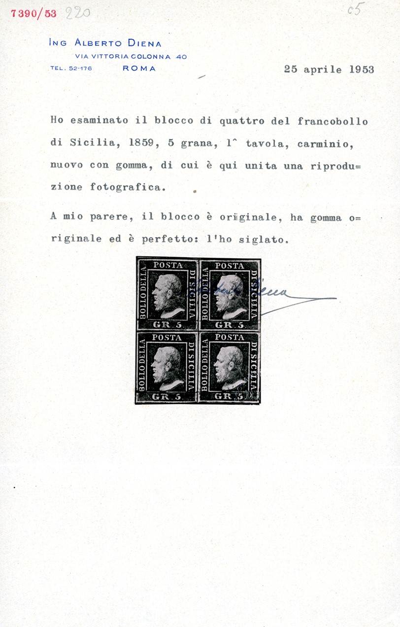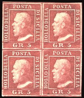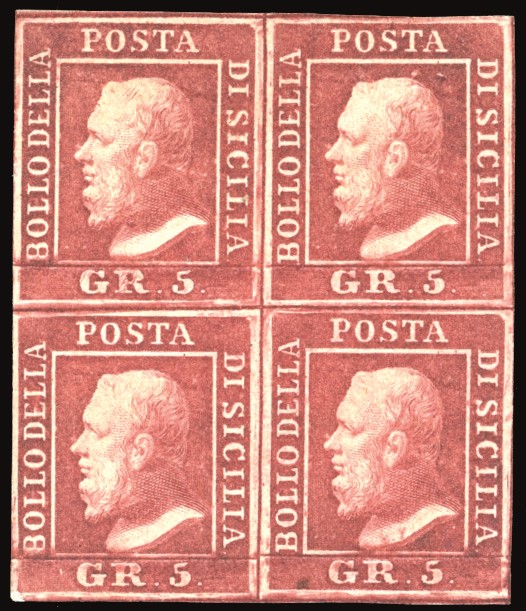 SICILIA 1859 - 5 grana carminio, I tavola (9a), blocco di quattro