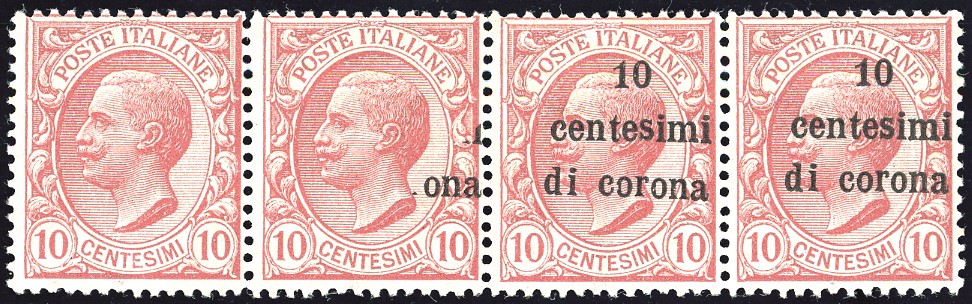 TERRE REDENTE - TRENTO E TRIESTE 1919 - 10 cent. su 10 cent. (4), striscia orizzontale di quattro