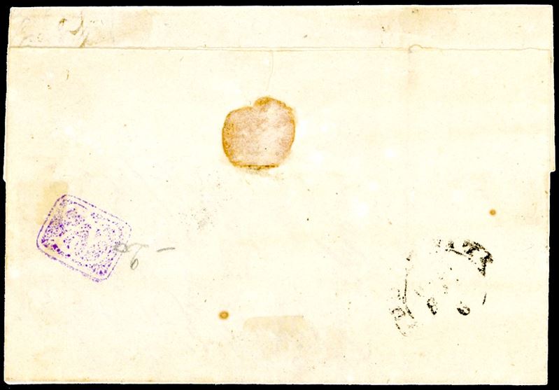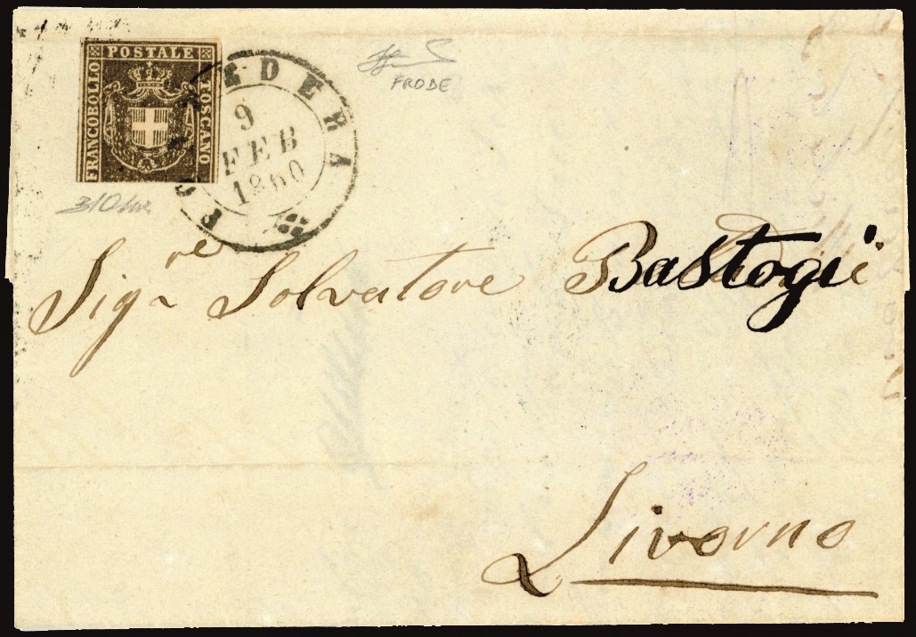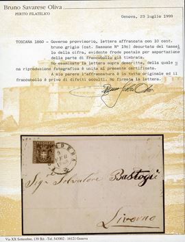 Parte inferiore del francobollo con il tassello del valore completamente asportata, tre ampi margini bianchi sugli altri lati, su lettera da Pontedera 9/2/1860 a Livorno. Interessante e rara FRODE POSTALE, con l'asportazione della porzione precedentemente annullata del francobollo. Cert. Ferrario e Oliva.