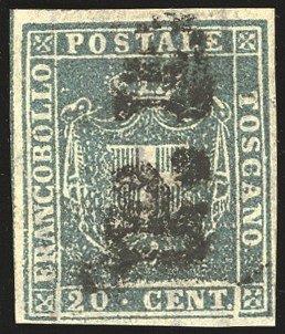 TOSCANA - GOVERNO PROVVISORIO 1860 - 20 cent. azzurro, parziale riga di riquadro verticale a sinistra (20e)