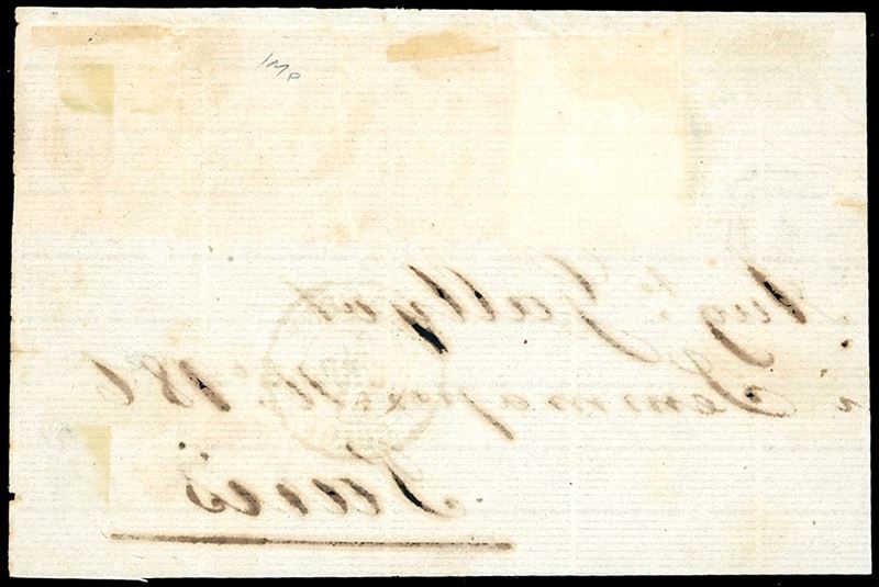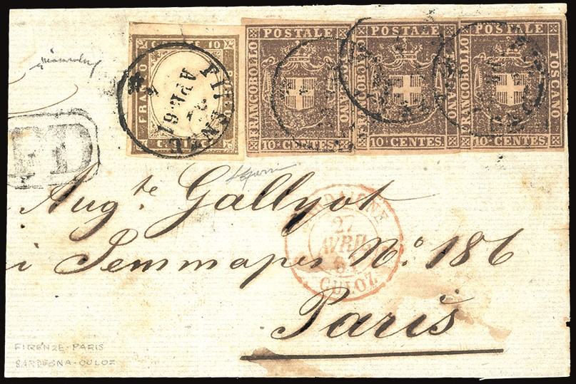 Su frontespizio praticamente completo di lettera da Firenze 24/4/1861 a Parigi, in Francia. Rara affrancatura mista impreziosita dalla presenze di valori gemelli da 10 cent., di ottimo aspetto. Chiavarello.