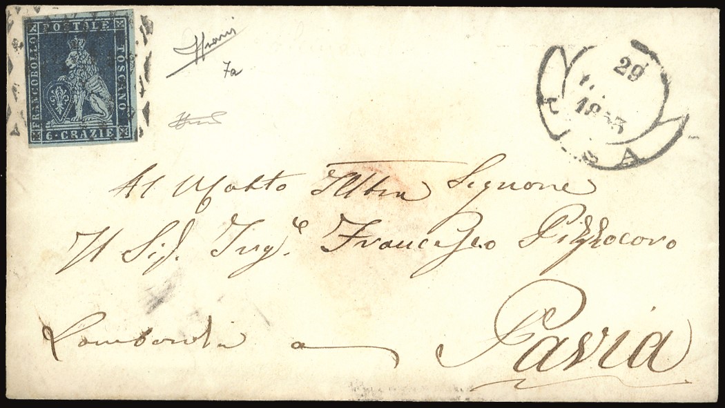 Tre ottimi margini, rasente a sinistra, su buste da Pisa 21/1/1853 a Pavia. Sorani, Ferrario. Cat. € 3.200