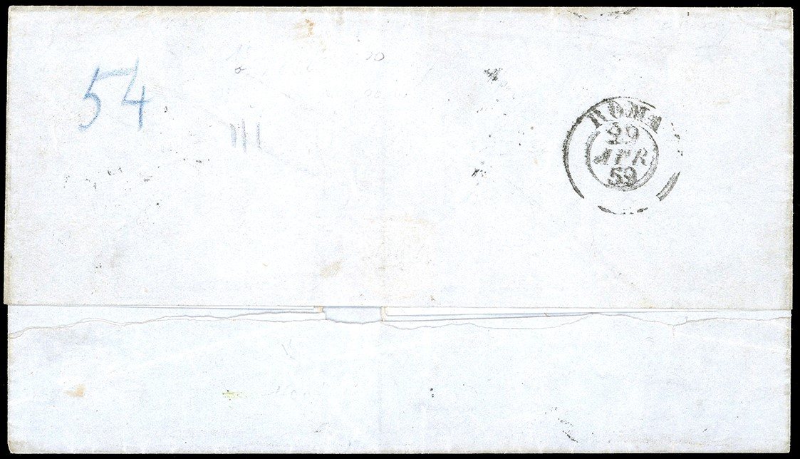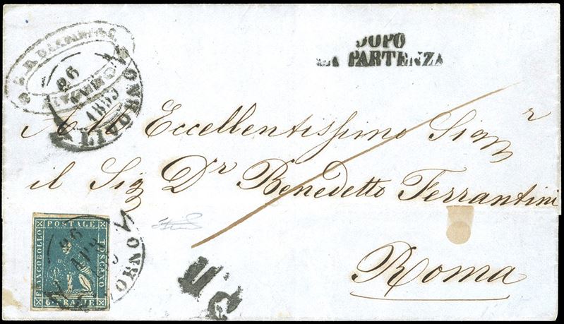Perfetto e ben marginato, su fresca lettera da Livorno 26/4/1859 a Roma, lineare su due righe "dopo la partenza" sul fronte. ULTIMO GIORNO DEL GOVERNO GRANDUCALE. Molto rara e di ottima qualità. Cert. Ferrario.