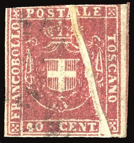 TOSCANA PLI D'ACCORDEON - COLLEZIONE DUCCIO 1860 - 40 cent. carminio, enorme pli d'accordeon obliquo e linea di riquadro verticale a destra (21e),