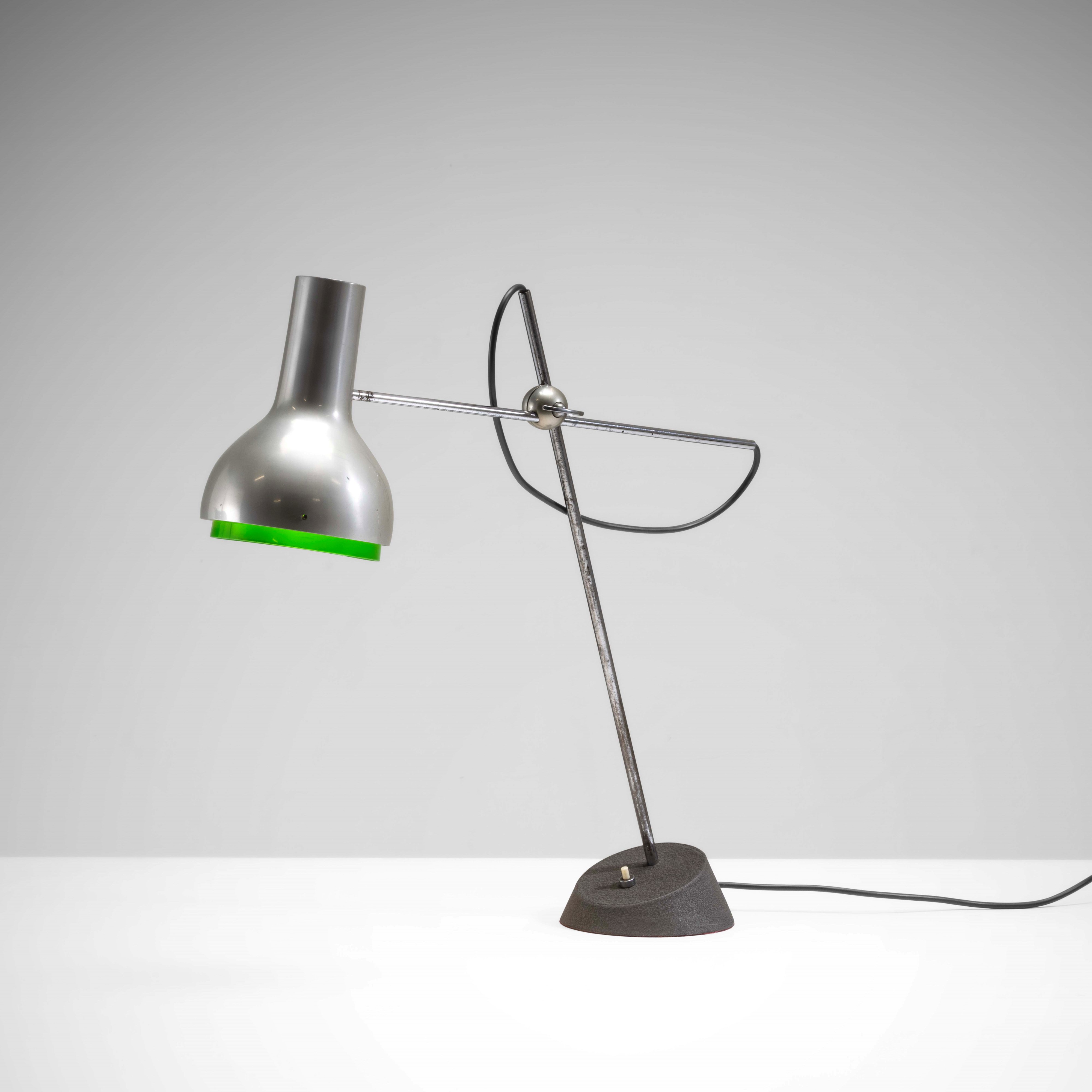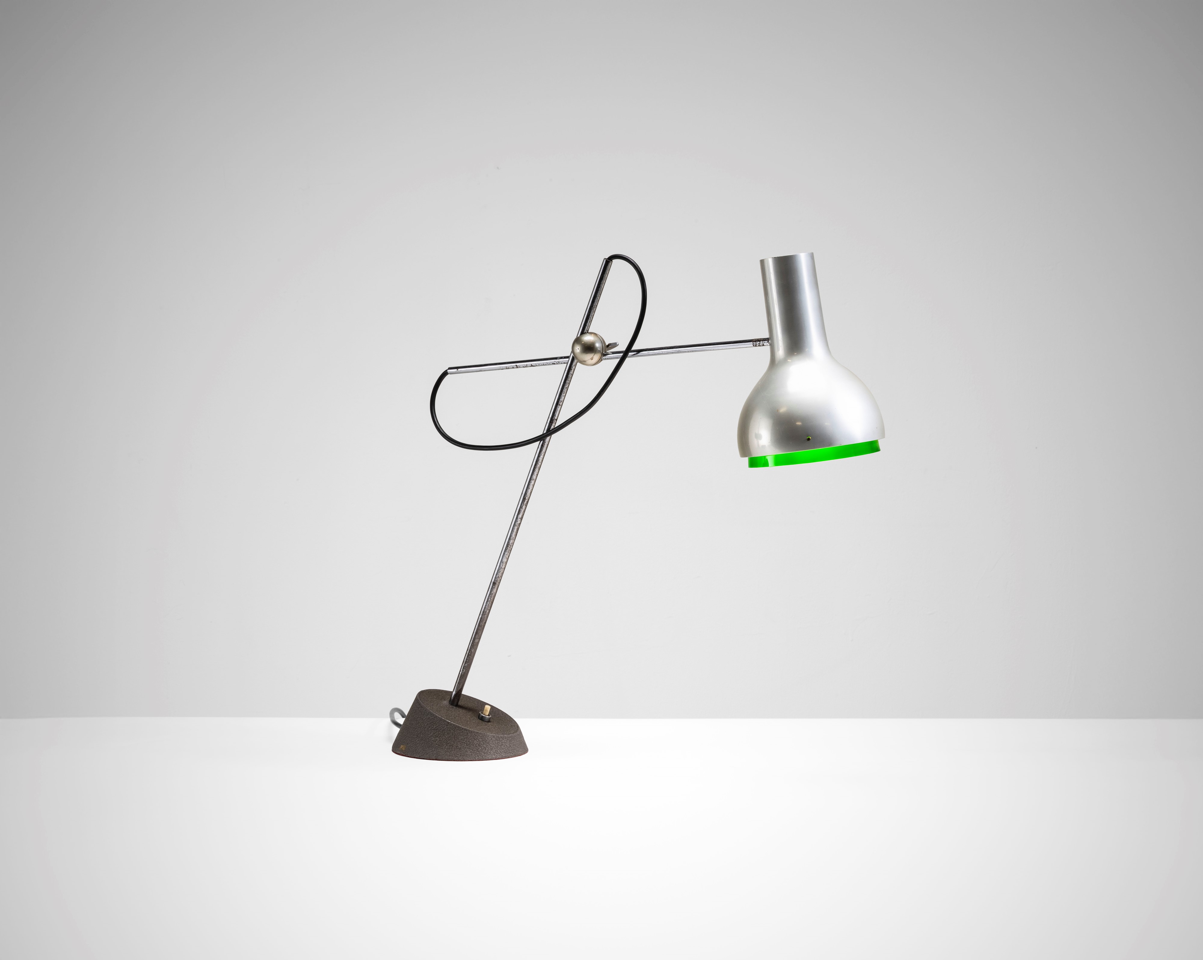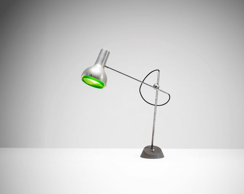 Struttura in metallo cromato, base in ghisa e diffusore in alluminio e metacrilato.