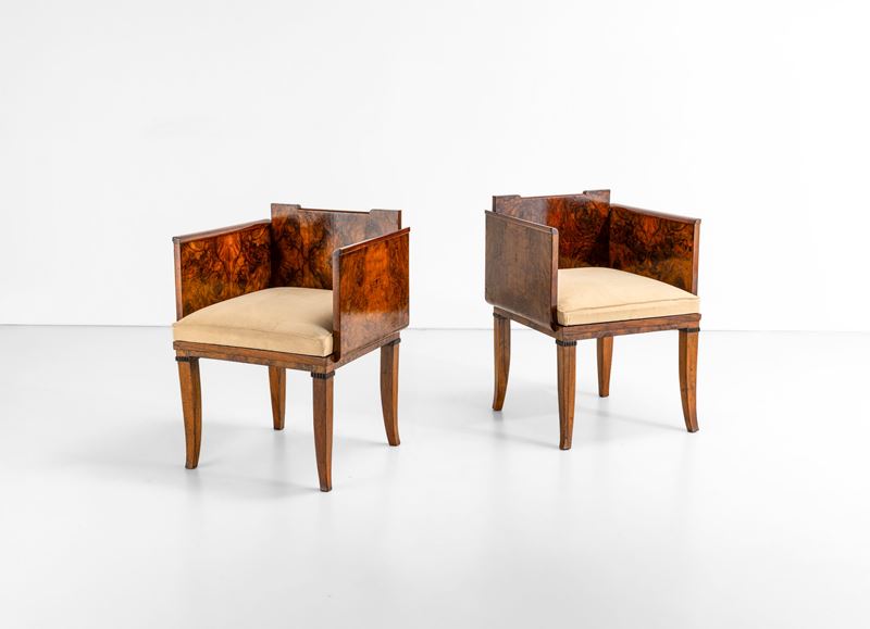 Struttura in legno e impiallacciatura in radica, rivestimento in tessuto.