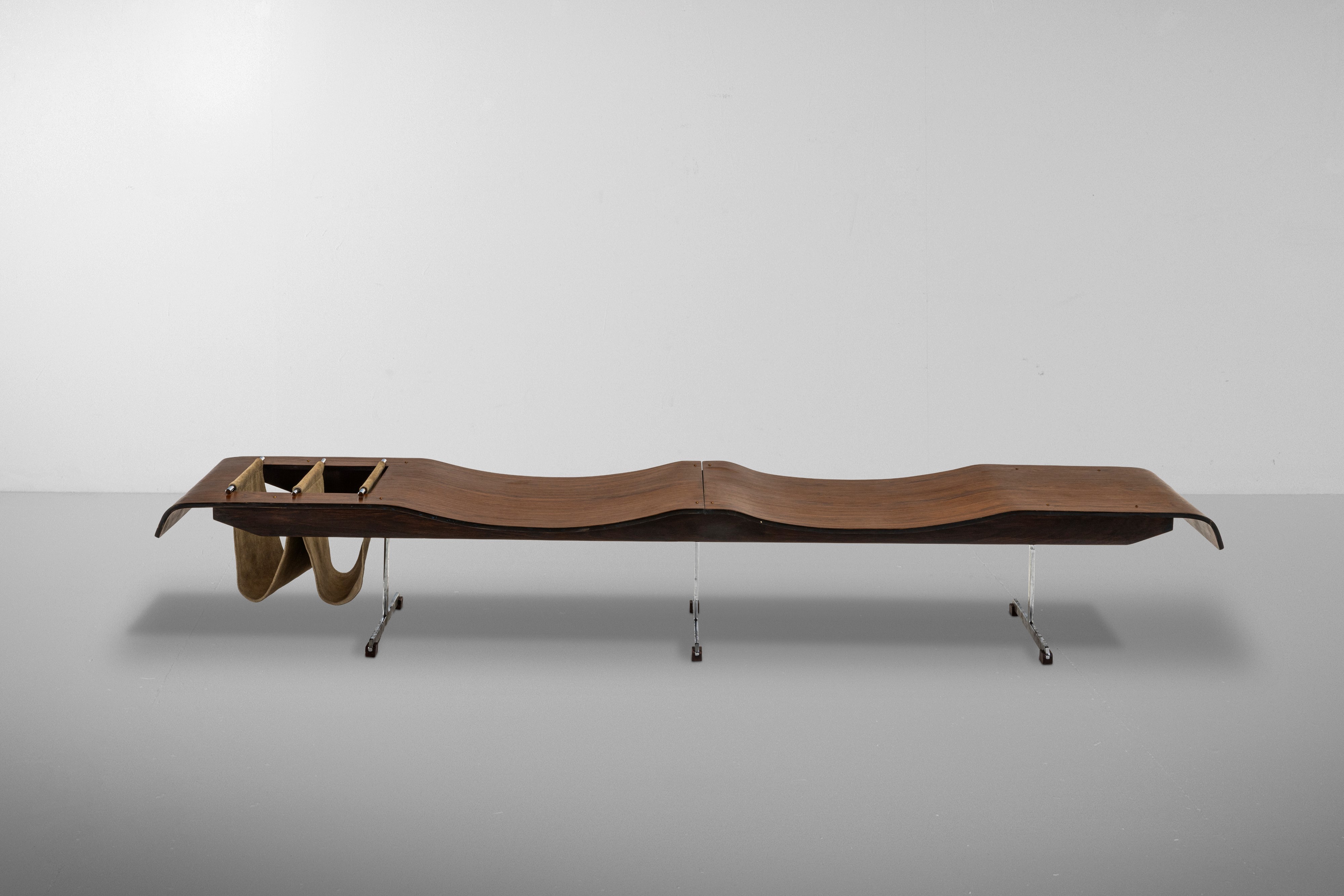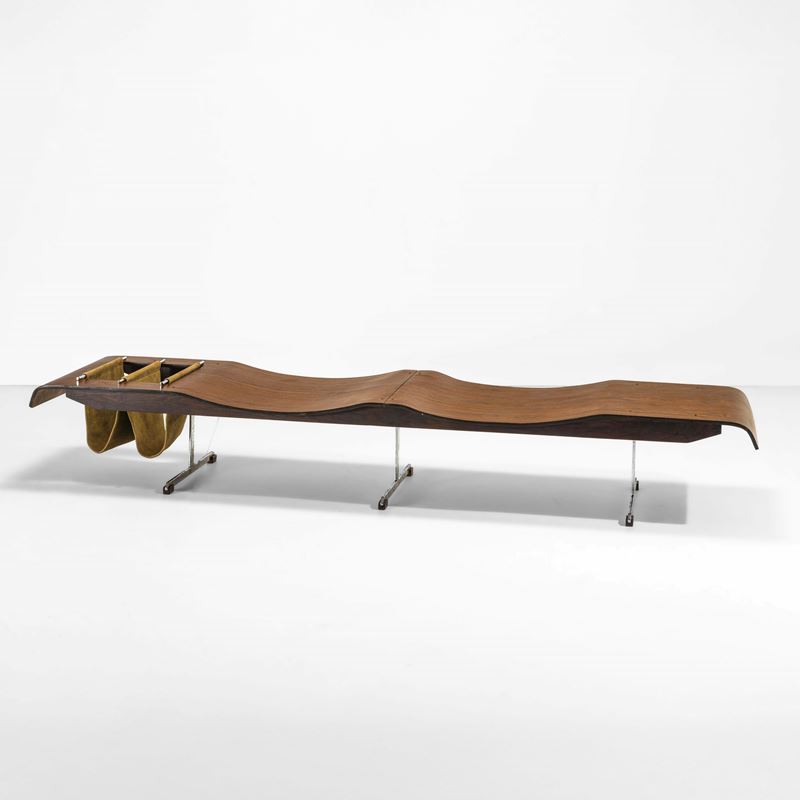 Struttura in legno compensato curvato di Jacaranda e metallo. Portariviste in pelle. Sostegni in metallo.