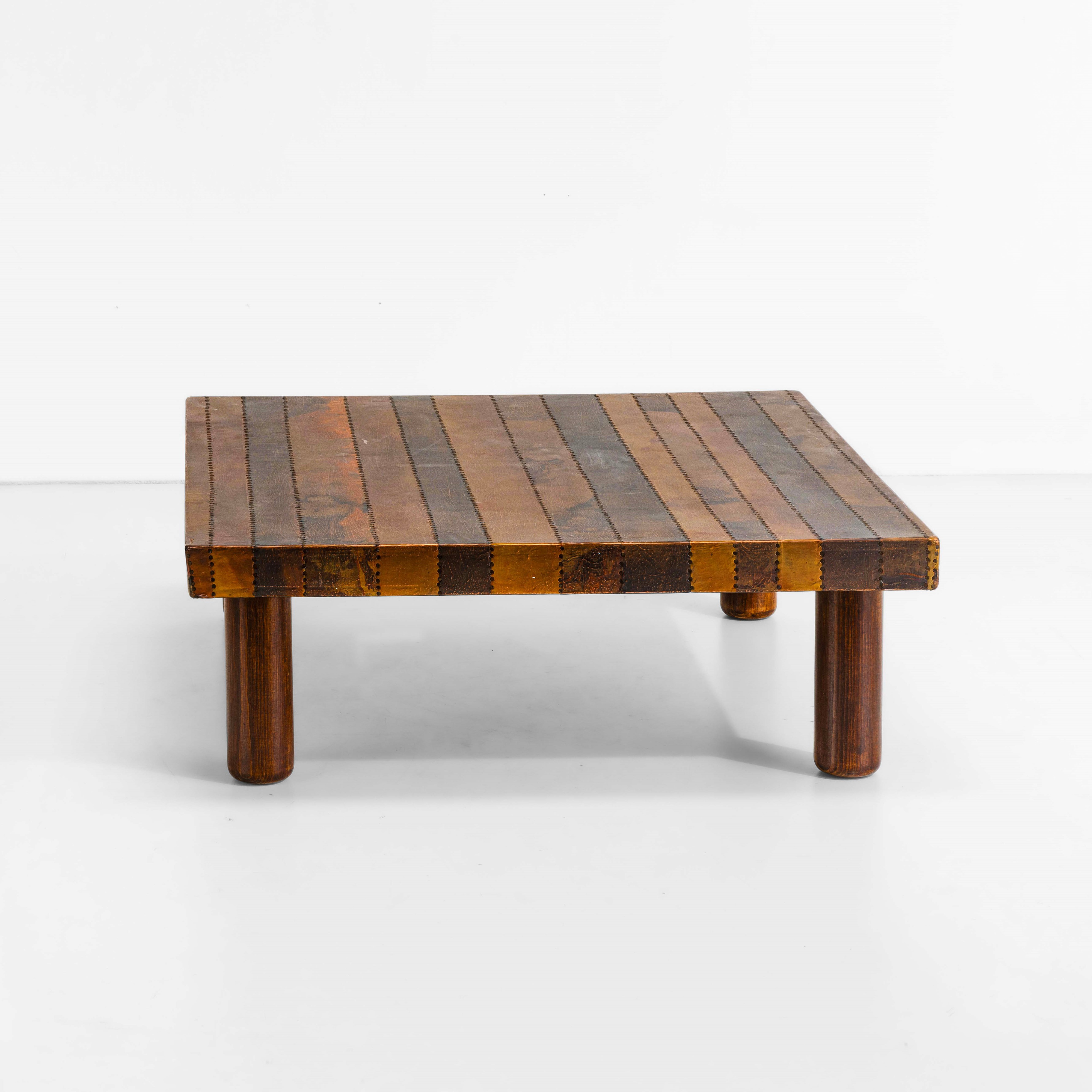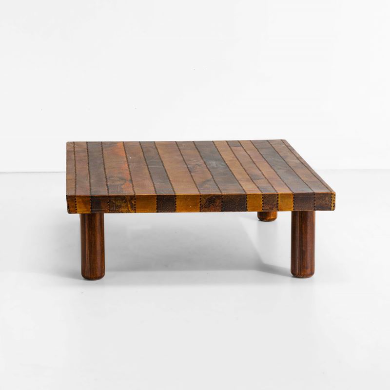 Piano in legno rivestito in rame sbalzato e ottone,
