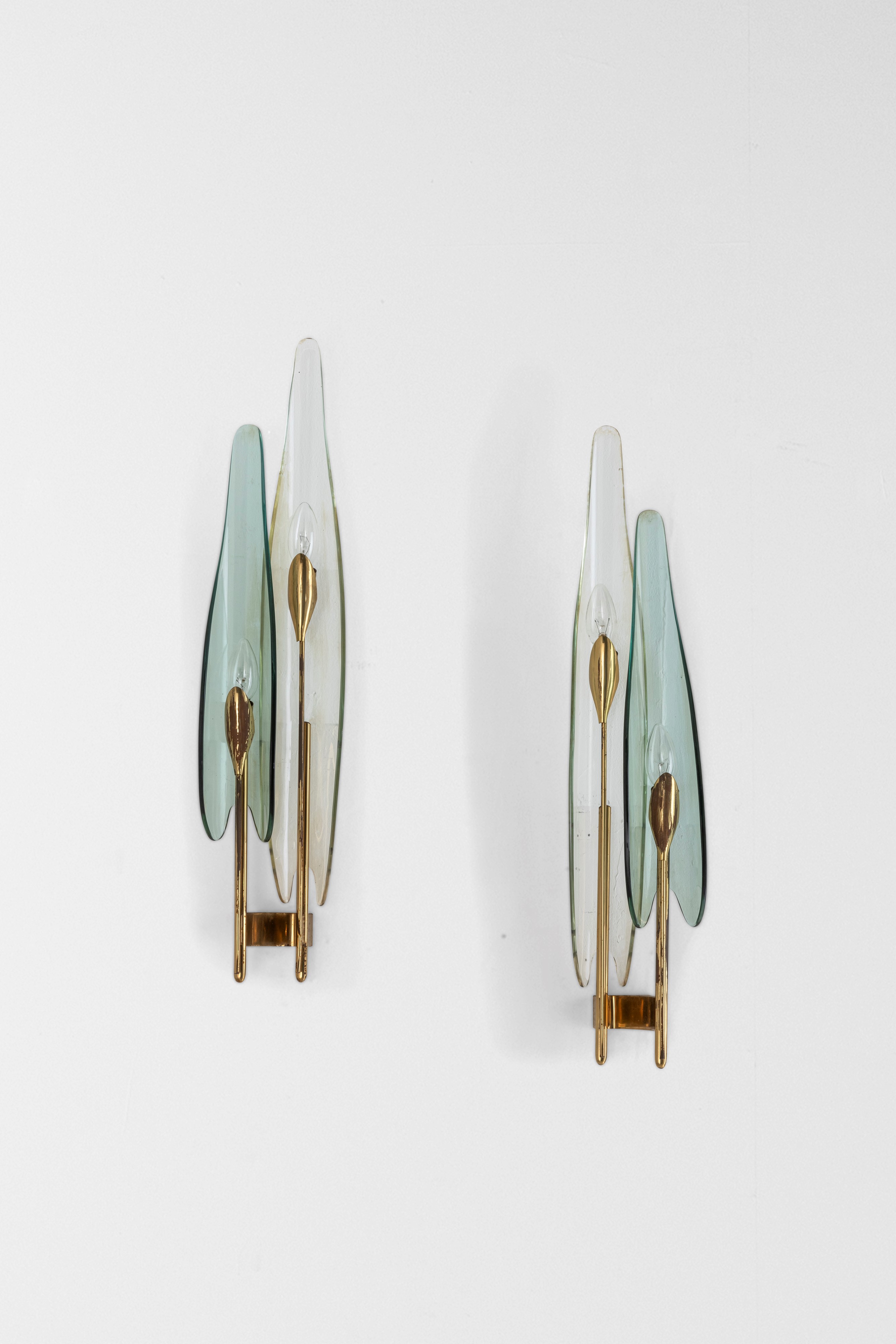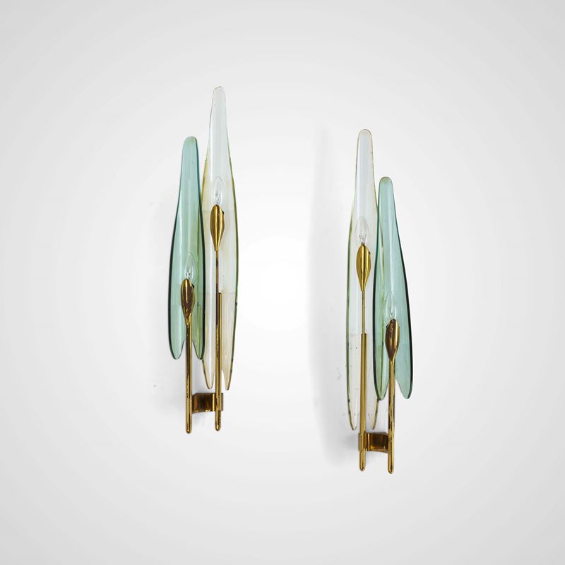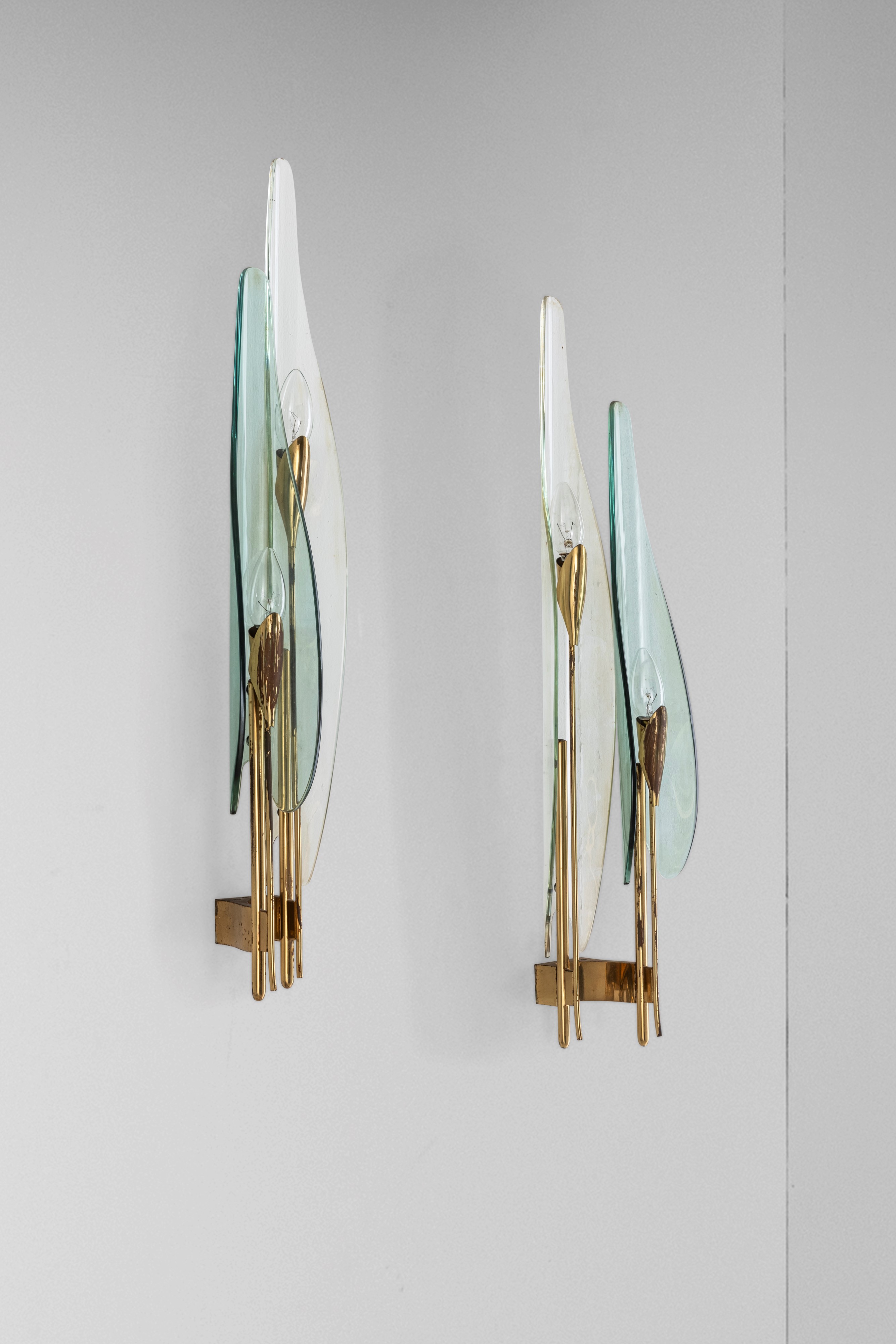 Diffusori in cristallo colorato, curvato e molato. Struttura in ottone.