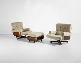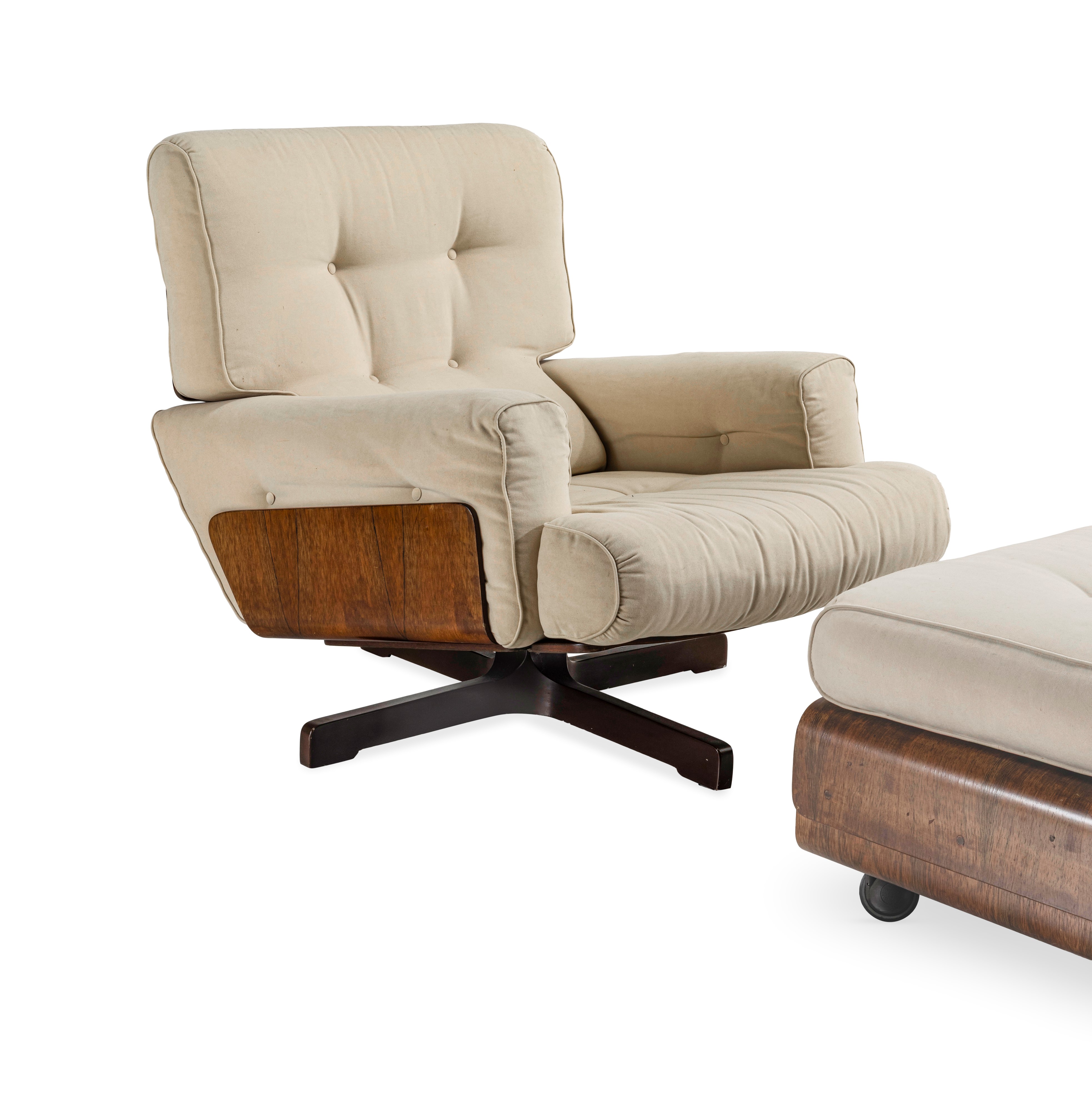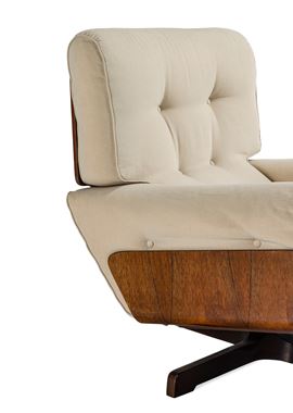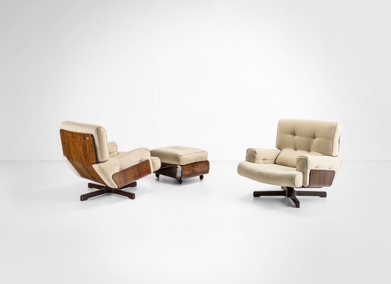 Struttura in compensato curvato e rivestimenti in tessuto. Sostegni in metallo laccato.
