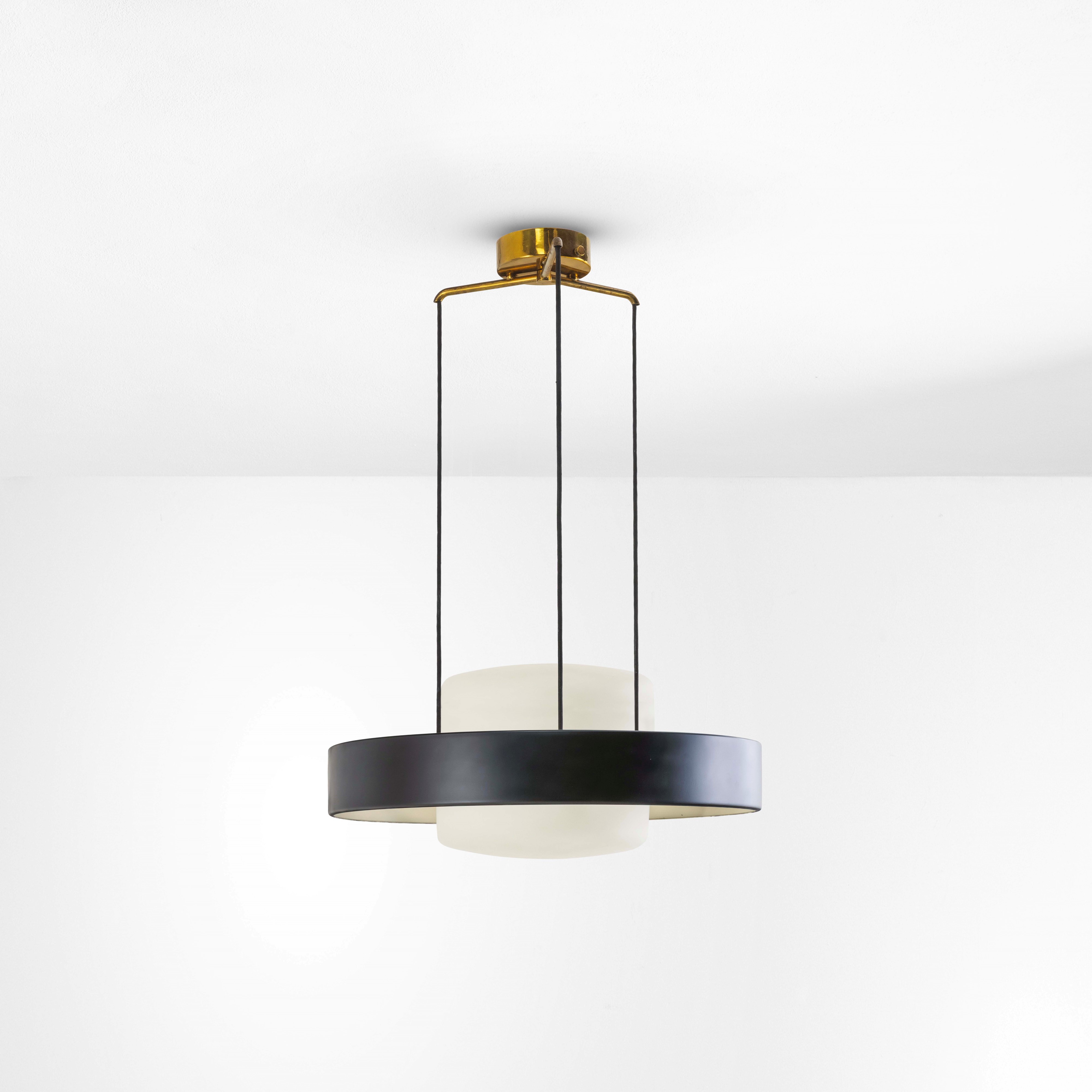 Struttura in ottone. Diffusore ad altezza regolabile in alluminio laccato e vetro opalino.