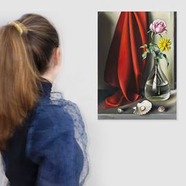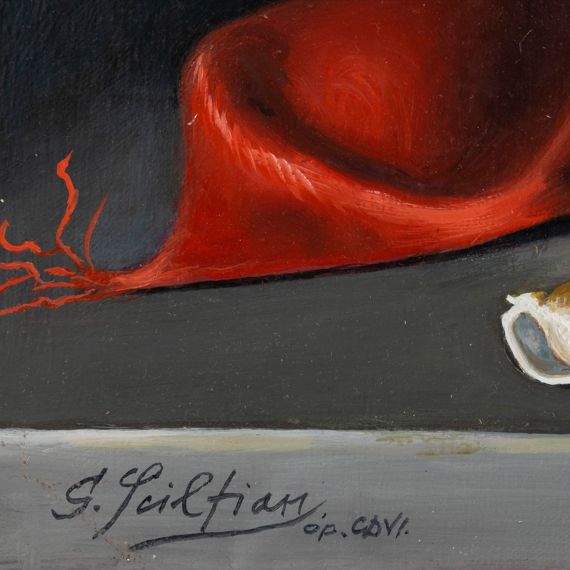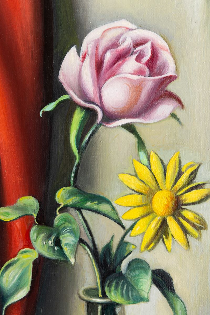 This painting, therefore, fits within a broad series of trompe l’oeil works in which the theme of the glass vase recurs, with Sciltian introducing small variations—choosing different flowers, modifying the objects, or simply changing their arrangement on the support surface. This compositional approach represents a significant novelty for Sciltian compared to his usual practice.