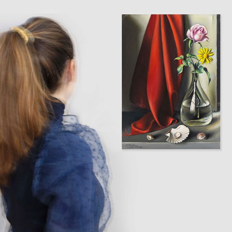 The painterly quality observed is consistent with the production of the period marking Sciltian’s move from Milan to Rome at the end of the 1960s. The work belongs to a significant group of paintings executed in 1970 for the Galleria Russo. Upon arriving in the capital, Sciltian had the opportunity to produce extensively for a wide network of collectors. The works painted during these early Roman years clearly evoke the compositions, still lifes, and trompe l’oeil that made him famous and sought-after on the market starting from the 1940s.
