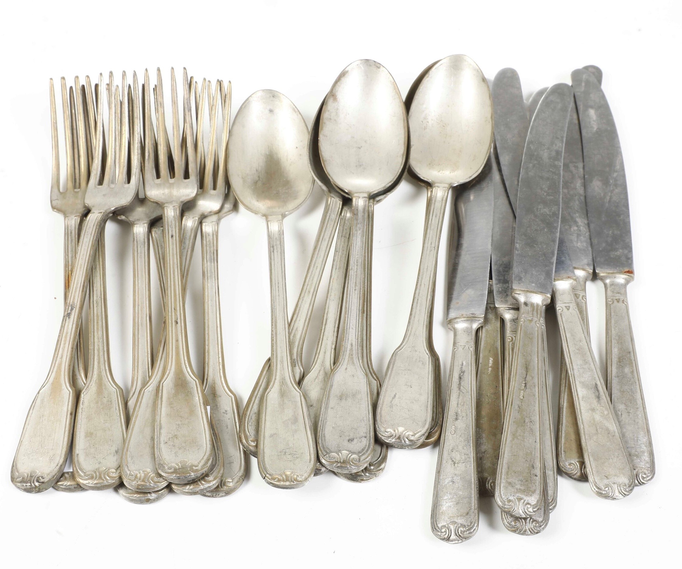 8 forchette, 8 coltelli e 7 cucchiai in metallo argentato