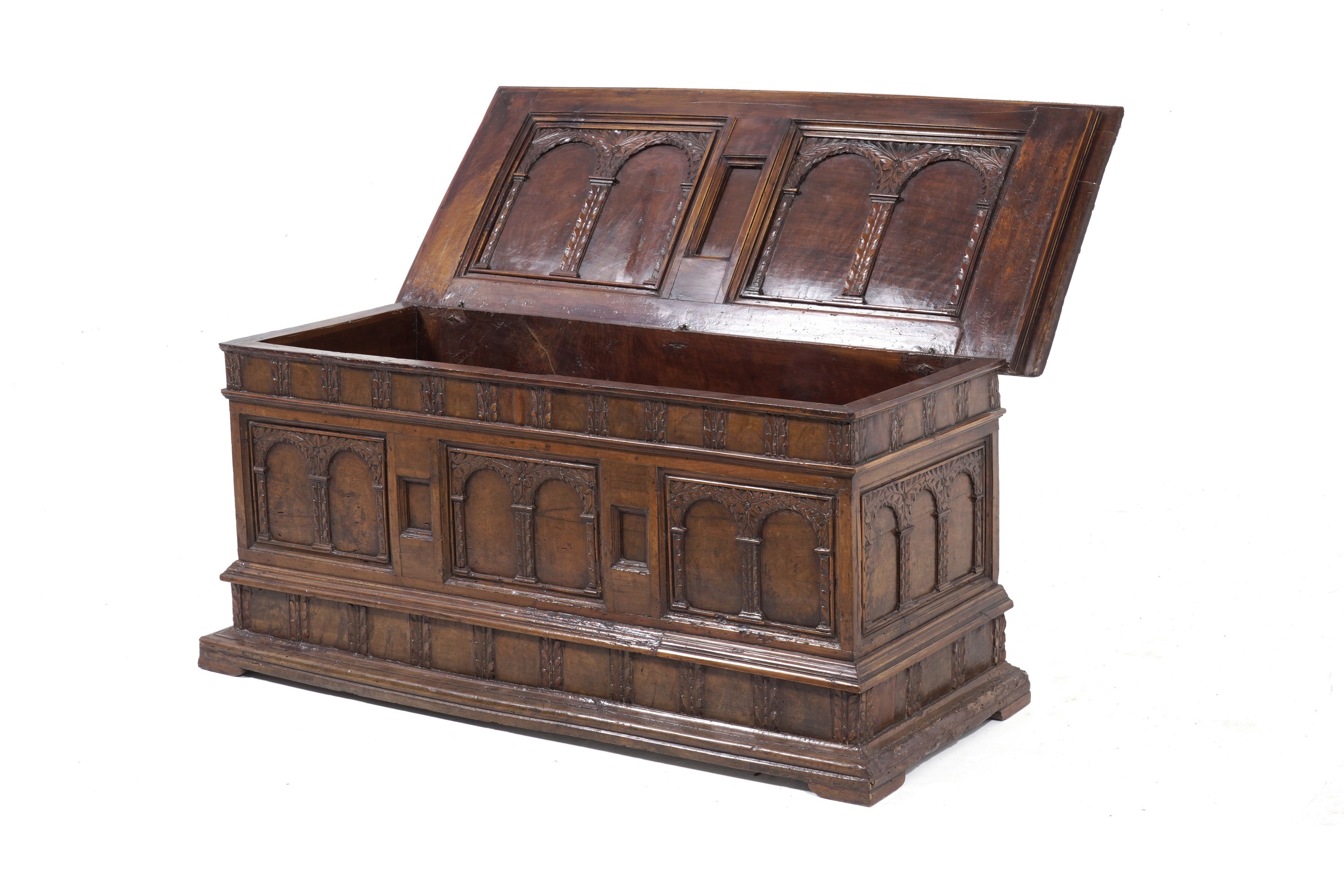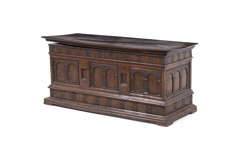 Intagliato a motivi architettonici di colonne e archi decorati a foglie e fiori (difetti)