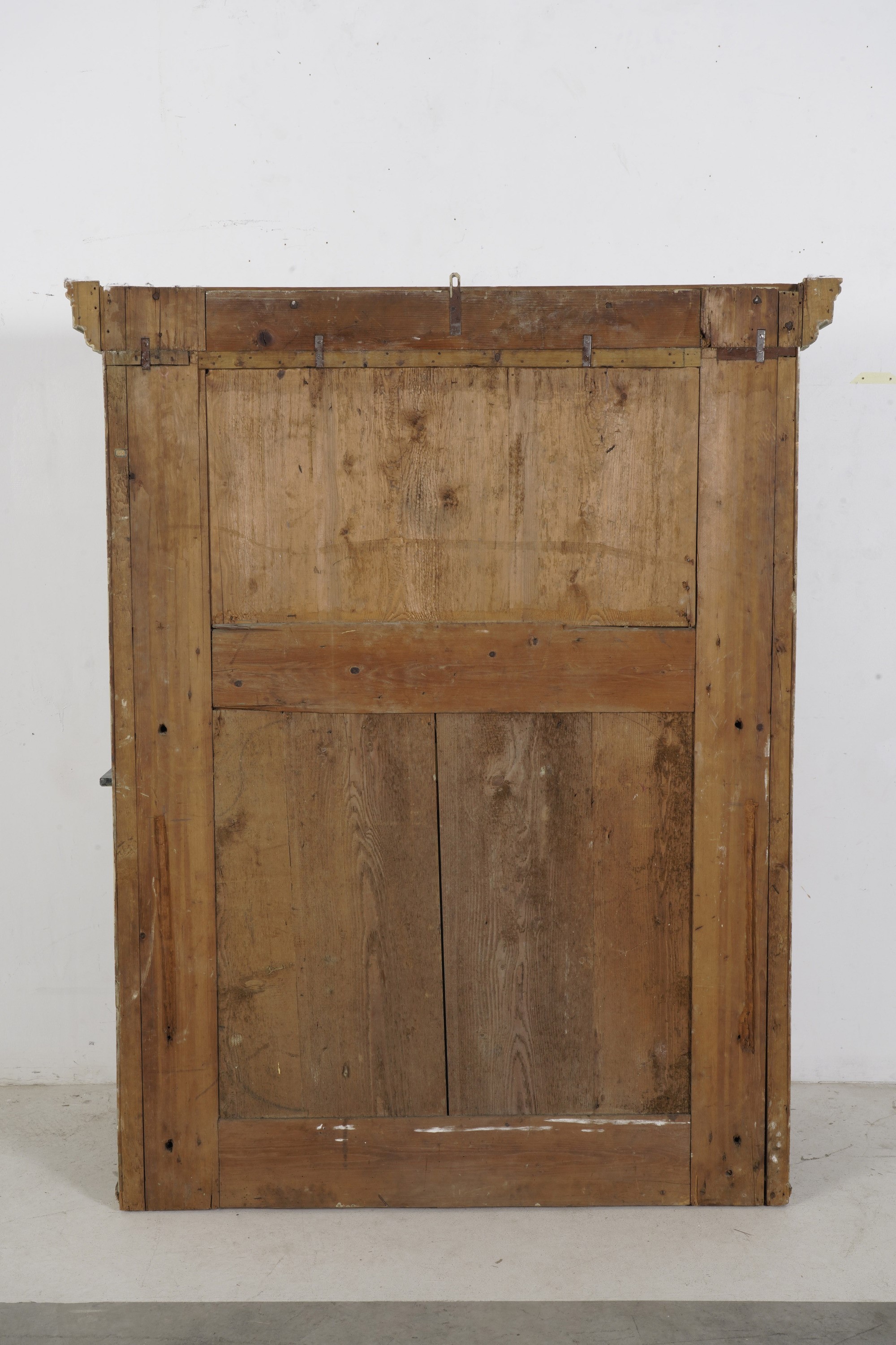 Decorazioni policrome a rilievo con ghirlande di fiori, alta cimasa centrata da vaso tra animali fantastici, piano in marmo di epoca posteriore