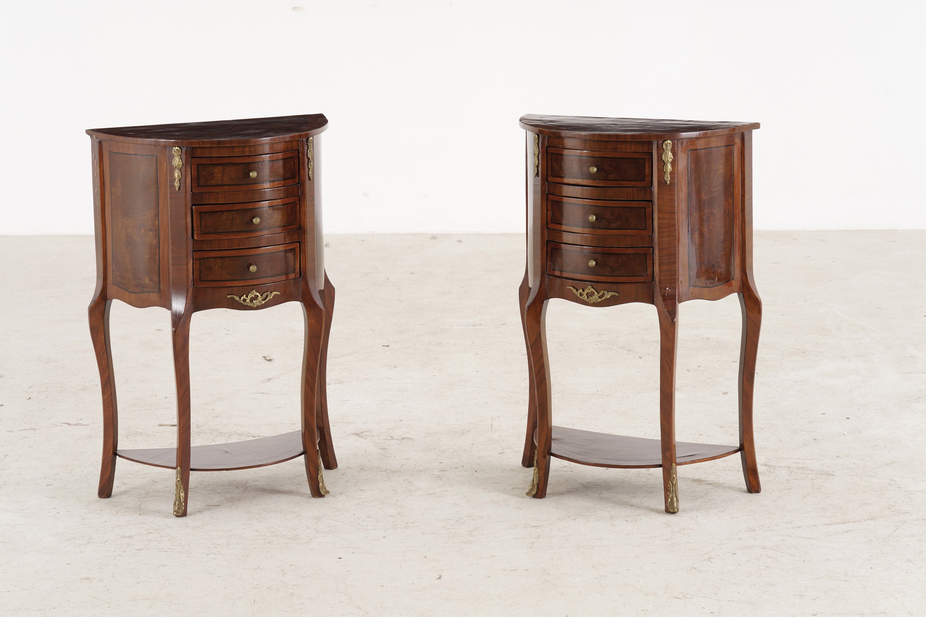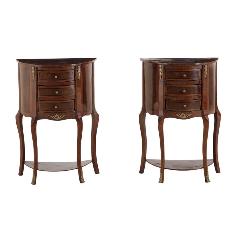 Coppia di comodini a mezzaluna lastronati e filettati. XX secolo