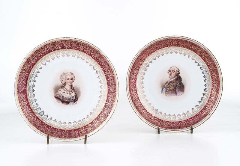 Coppia di piatti raffiguranti Luigi XVI e Maria Antonietta.