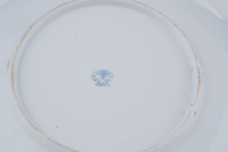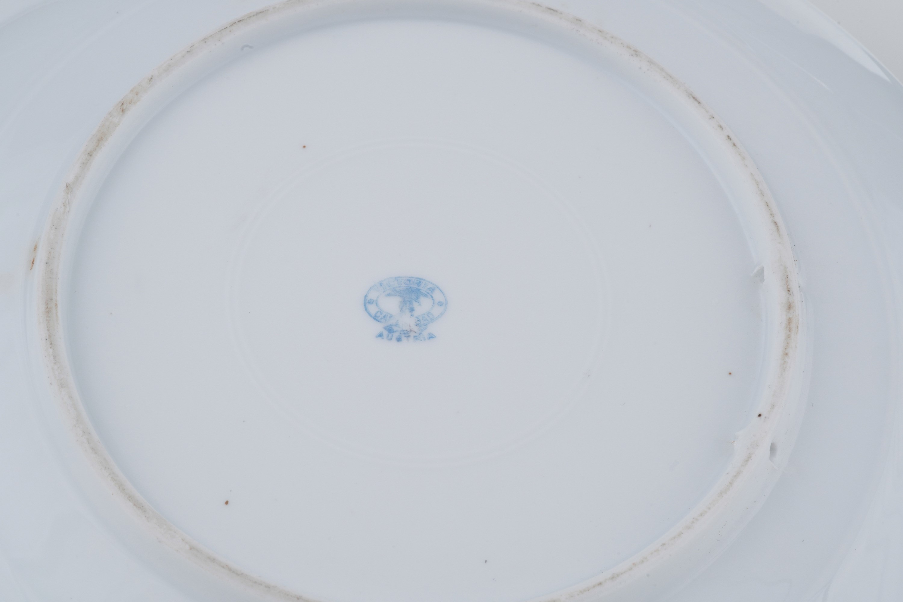 Porcellana. Marca: simbolo grafico con "Victoria Carlsbad Austria". Diametro cm 29,6. Conservazione: ottima; leggere usure all'oro del bordo.