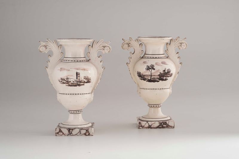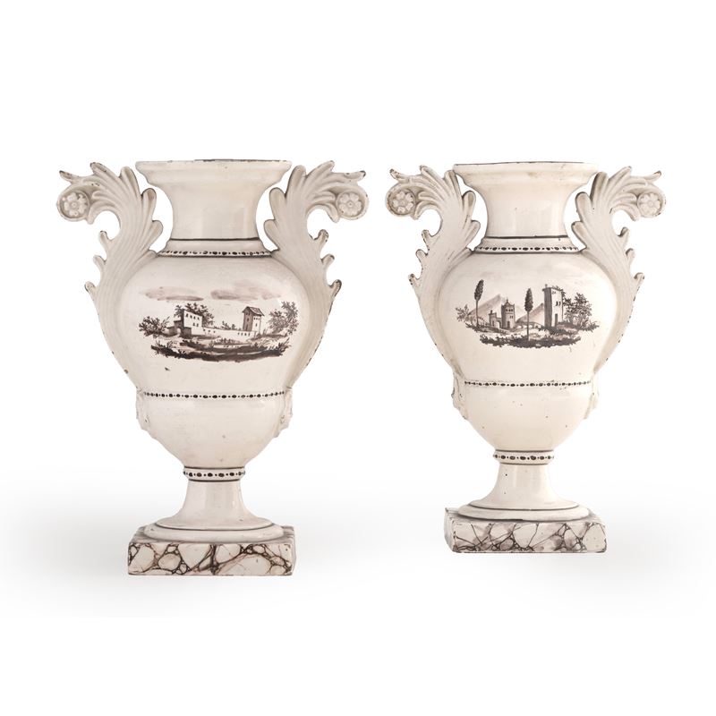 Coppia di vasi in terraglia bianca dipinti