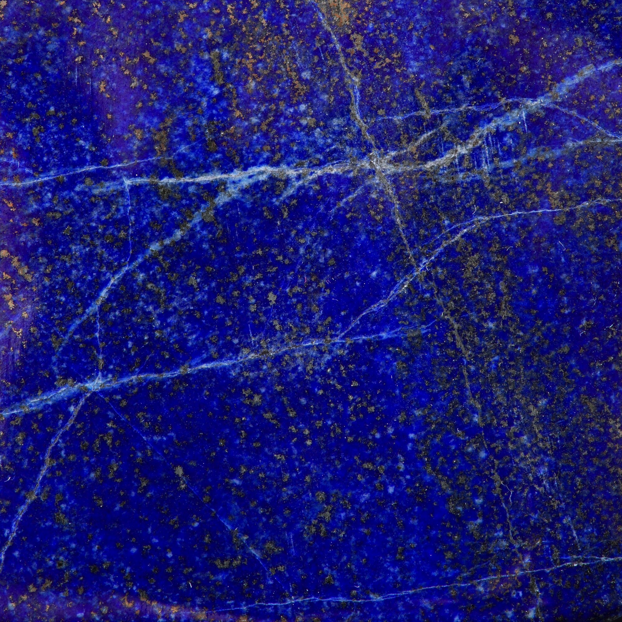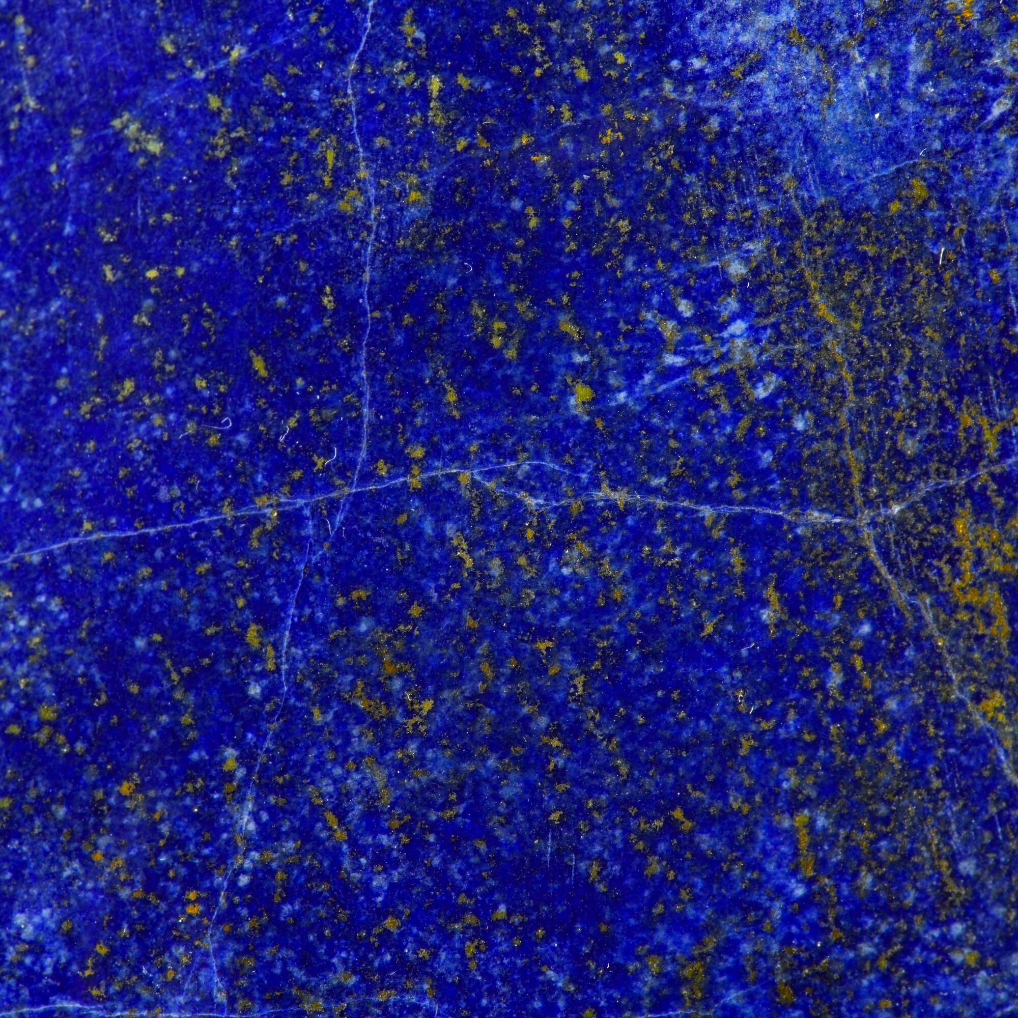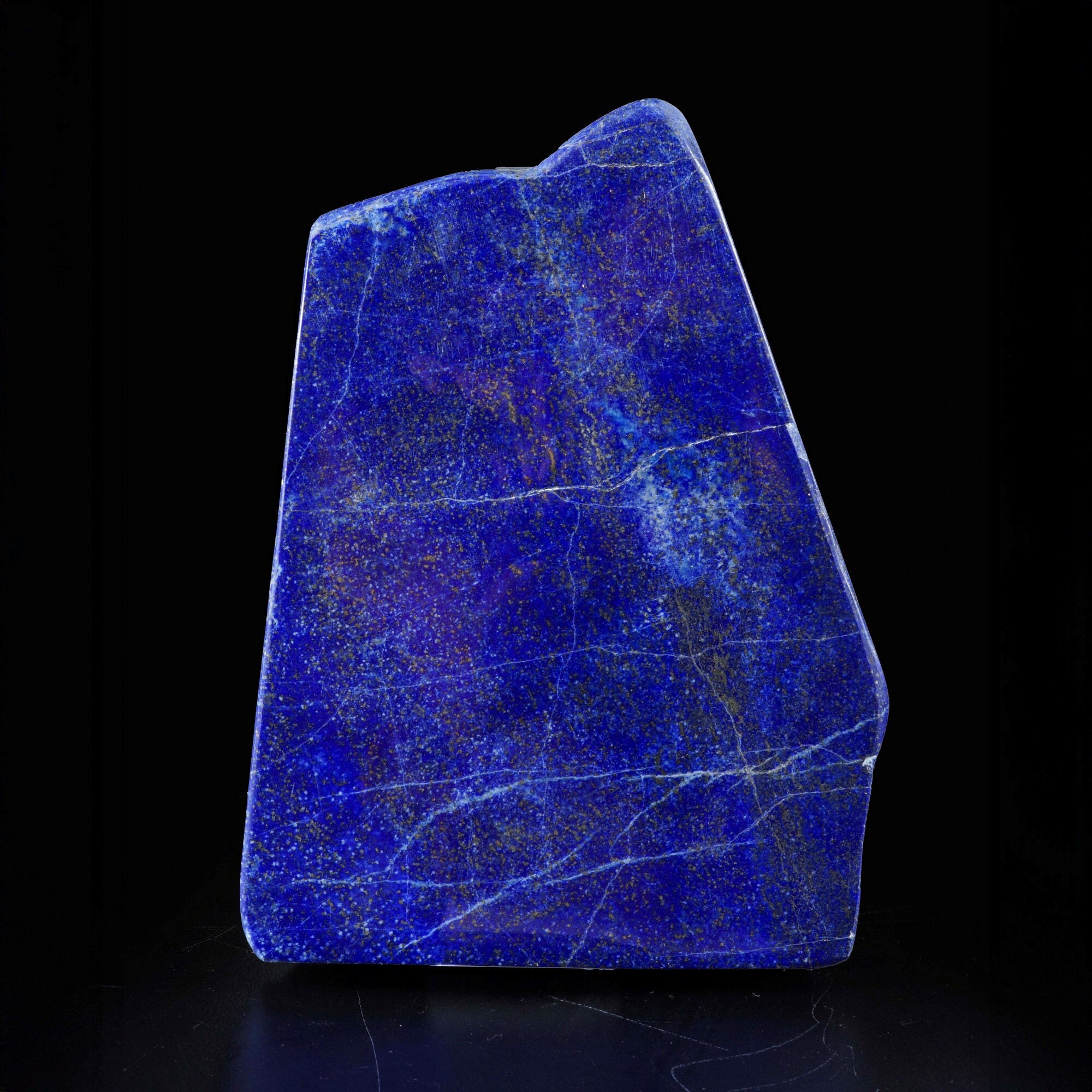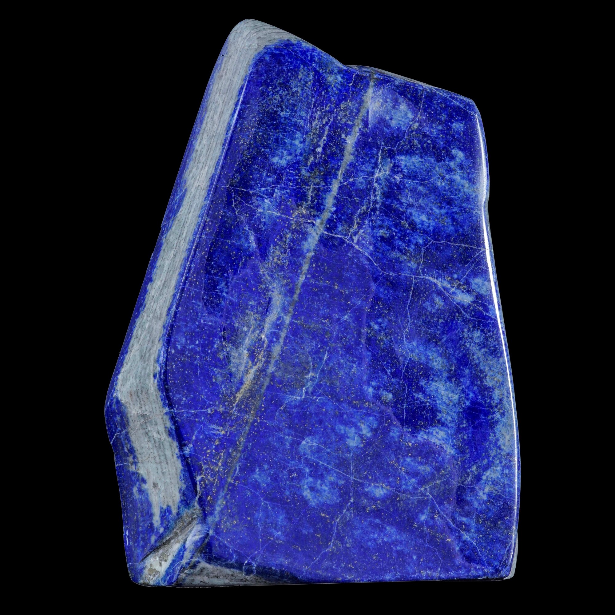 Questa splendida lastra di lapislazzuli di colore blu è stata trovata in Afganistan, lucidata a diamante ed è uno splendido esemplare del peso di più di 1,5 kg. Ha un bellissimo colore blu reale scuro su entrambi lati ed inclusioni di pirite. Le inclusioni di pirite sono presentate nel lotto con una serie di foto in ultravioletto.