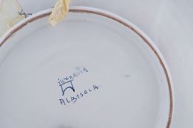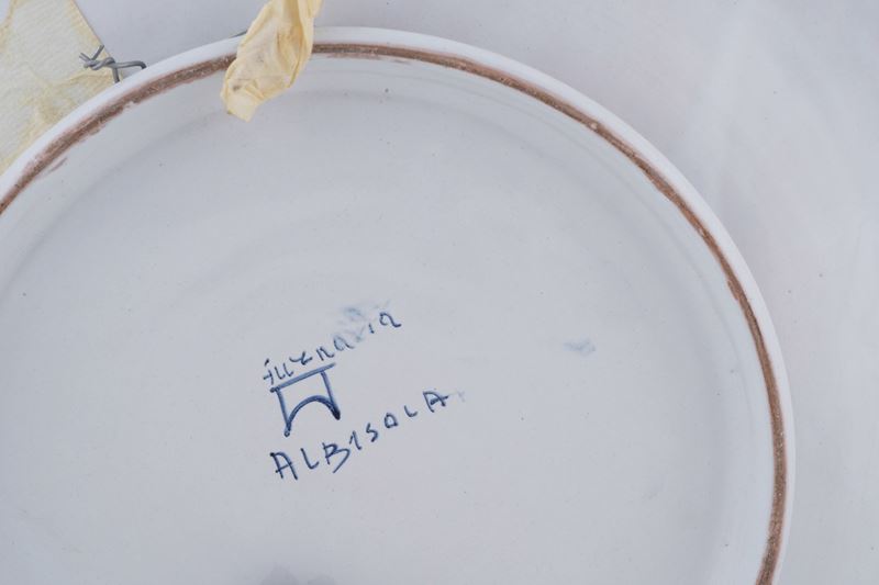 Maiolica decorata in policromia. Marca: "Furnaria Albisola" con simbolo grafico. Diametro cm 41,2. Conservazione: ottima.