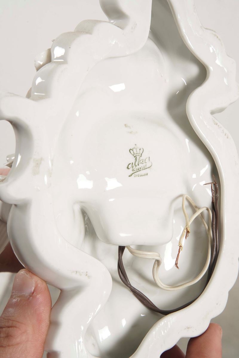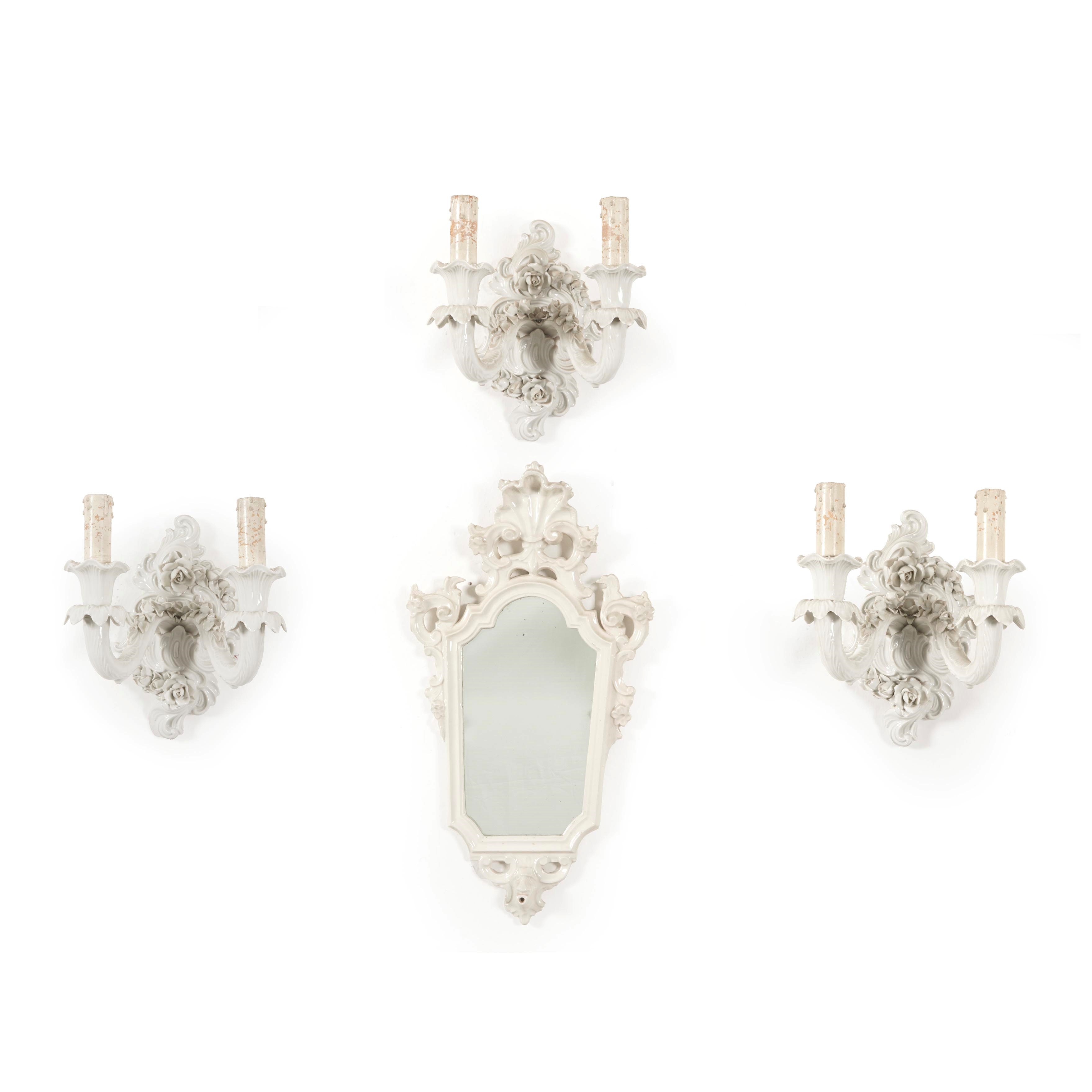 Lotto di quattro appliques e una specchiera in porcellana bianca, XX secolo