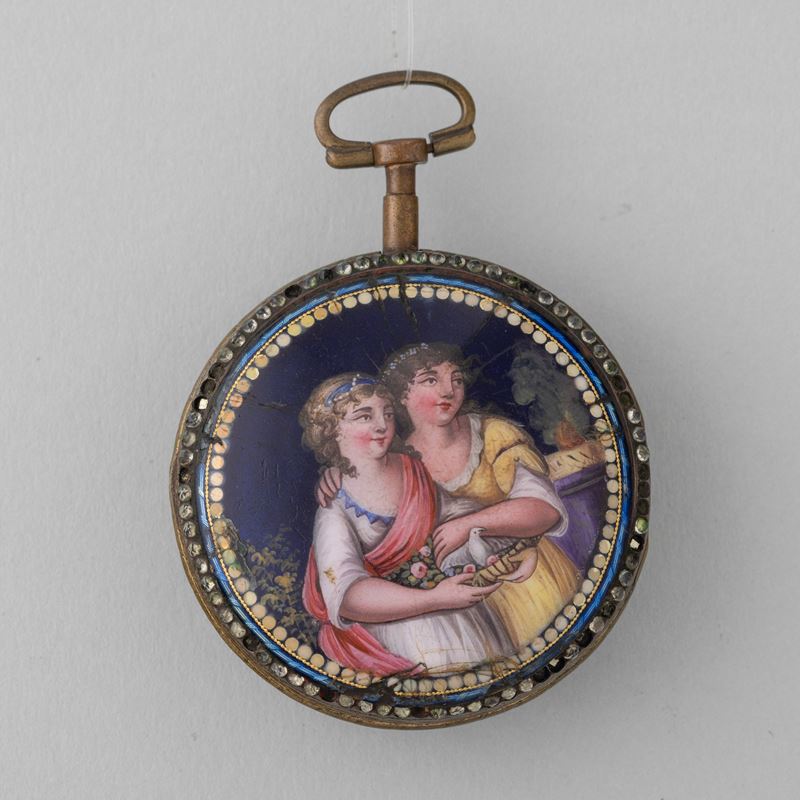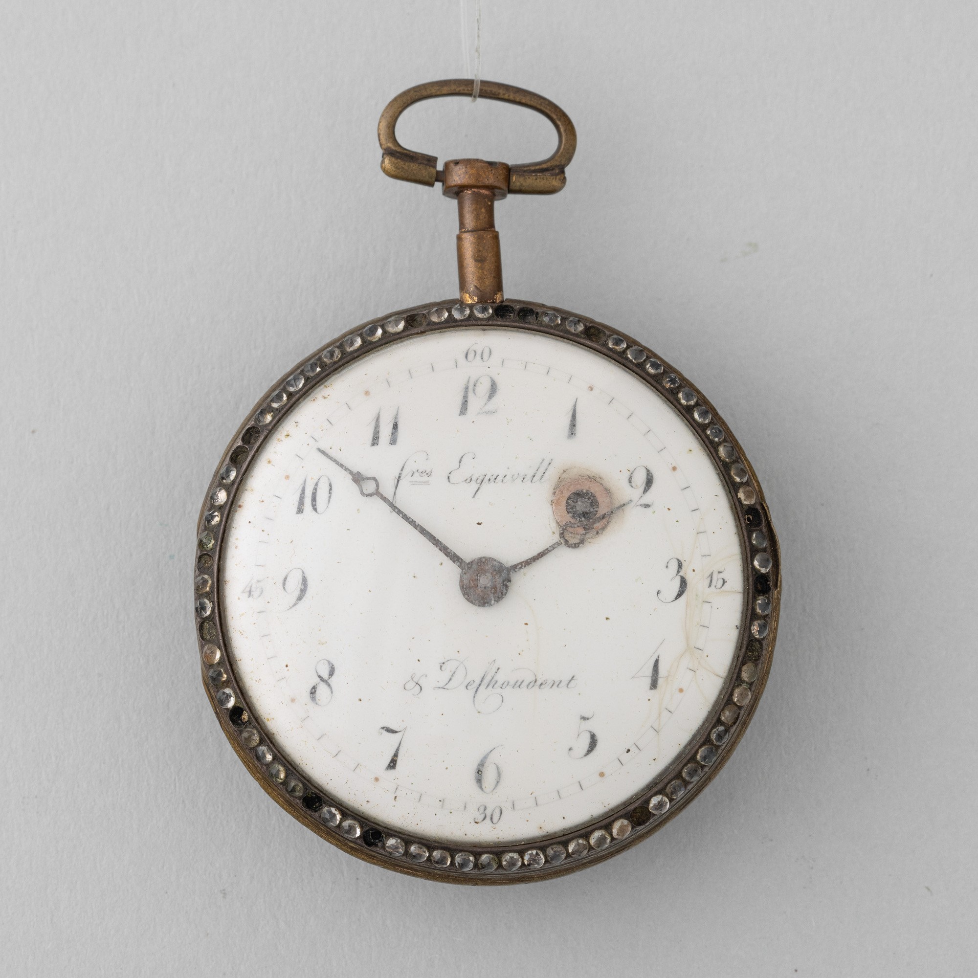 Orologio da tasca con cassa in ottone e smalto, scappamento a verga, Svizzera 1790 ca.