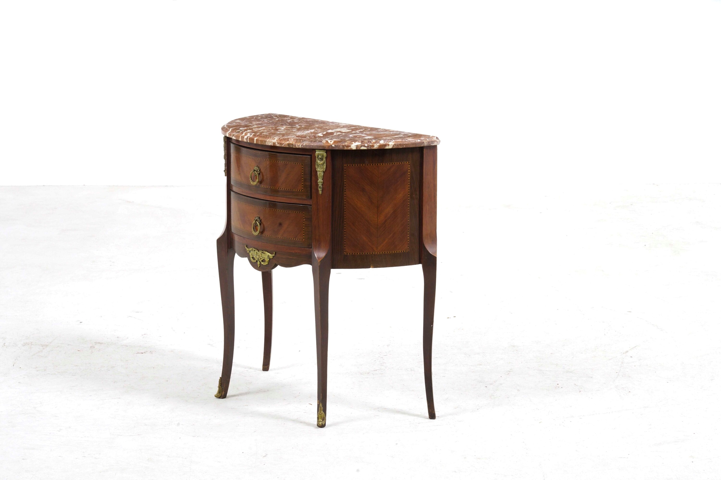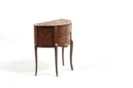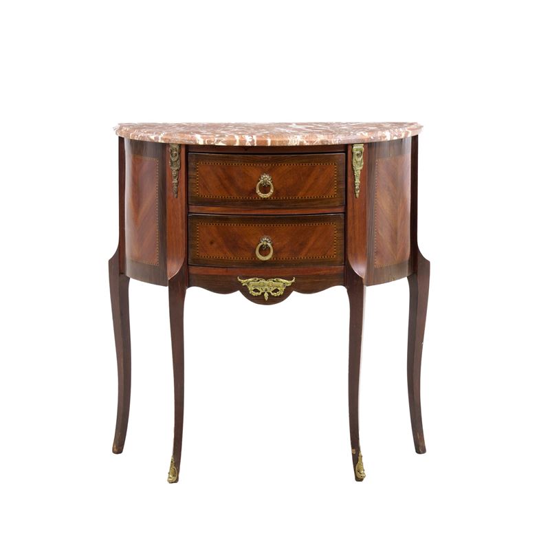 Piccolo comò a mezzaluna in stile francese lastronato in mogano e legni vari con piano in marmo, In stile