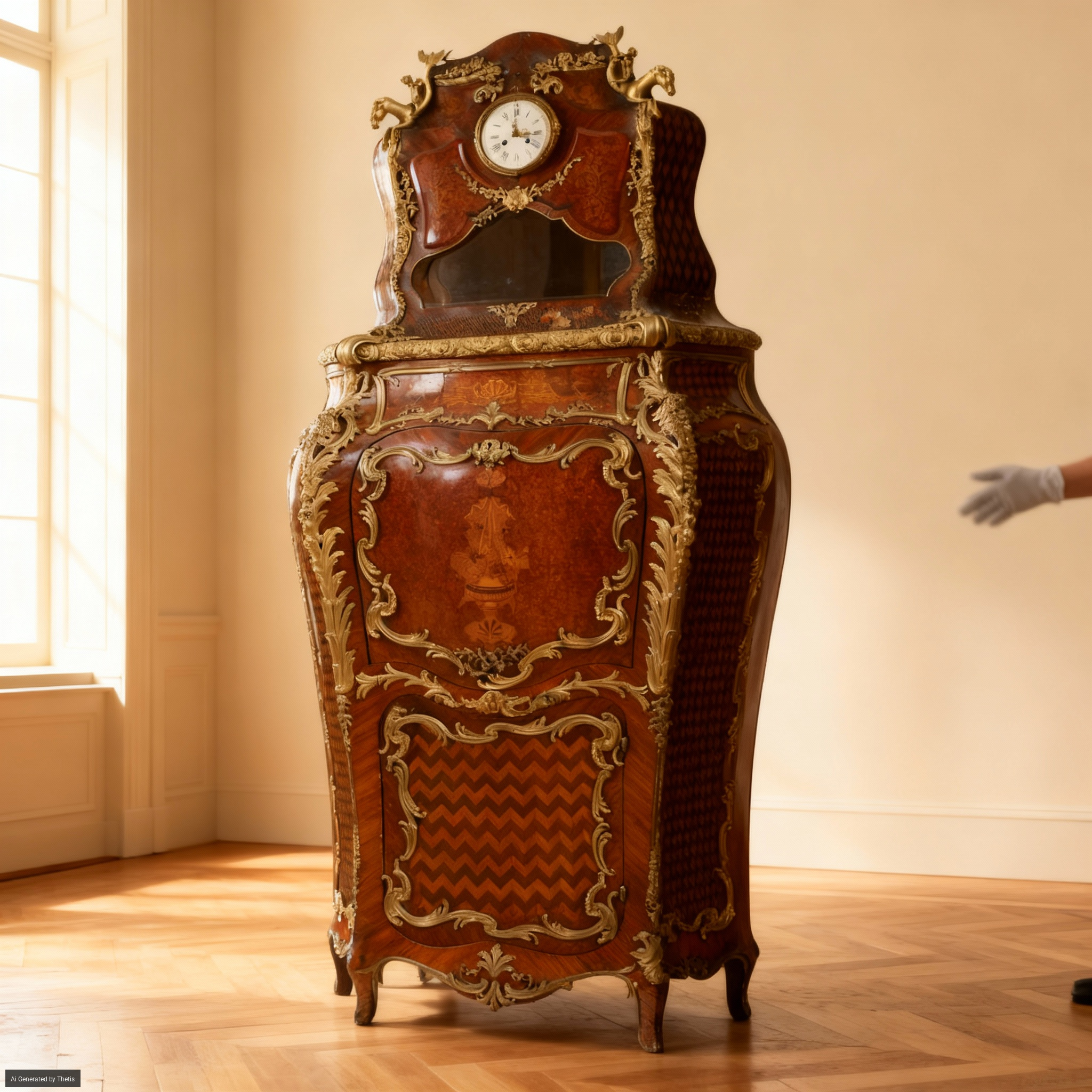 Forma mossa e bombata, fronte e fianchi incorniciati da ricchi decori in bronzo dorato a volute ed elementi rocailles, intarsi fitomorfi e a motivi geometrici