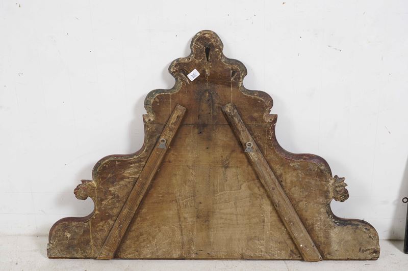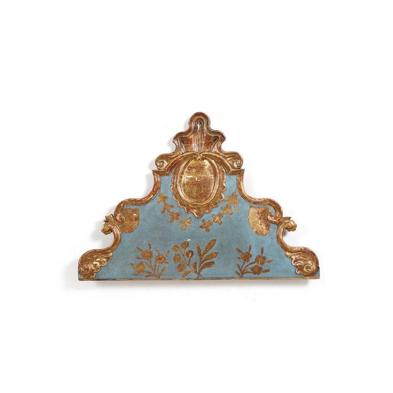 Testiera di letto in legno intagliato, dipinto e dorato.
