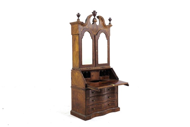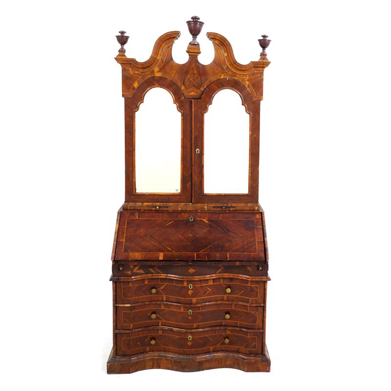 fronte mosso a tre cassetti, calatoia celante cassettini, vani a giorno e segreti, alzata a due ante a specchio con cimasa a timpano spezzato (difetti, restauri)