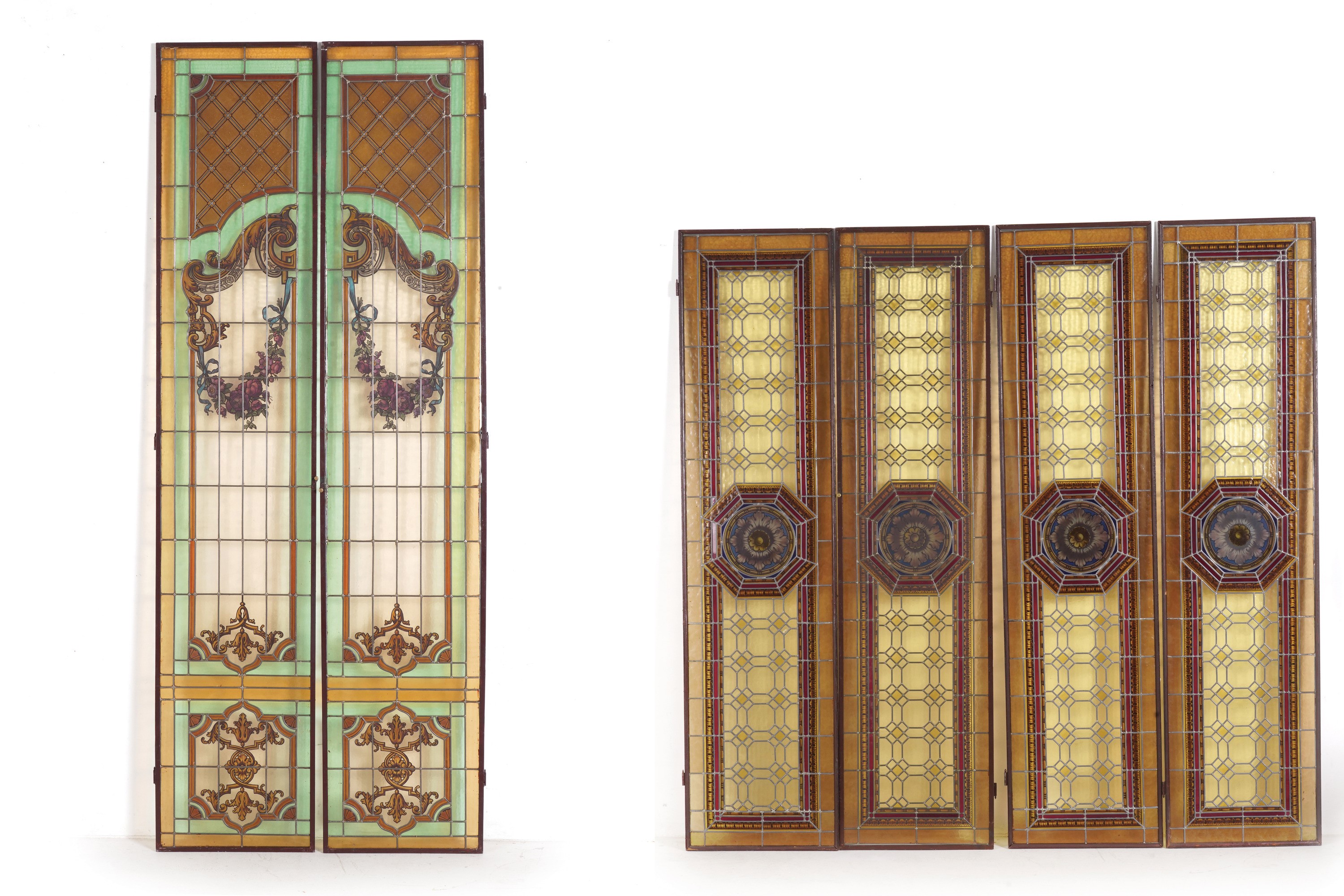 Due vetrate doppie con rosone centrale e una con motivi rocaille e festoni floreali da cm 47,5x190 a cm 48x240