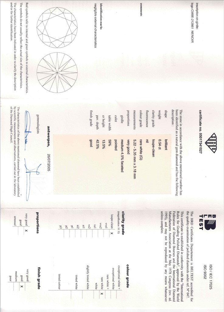 Brilliant-cut diamond weighing carats 0.54 and gold necklace. Gemmological Report HRD Antwerp n. 05017541027