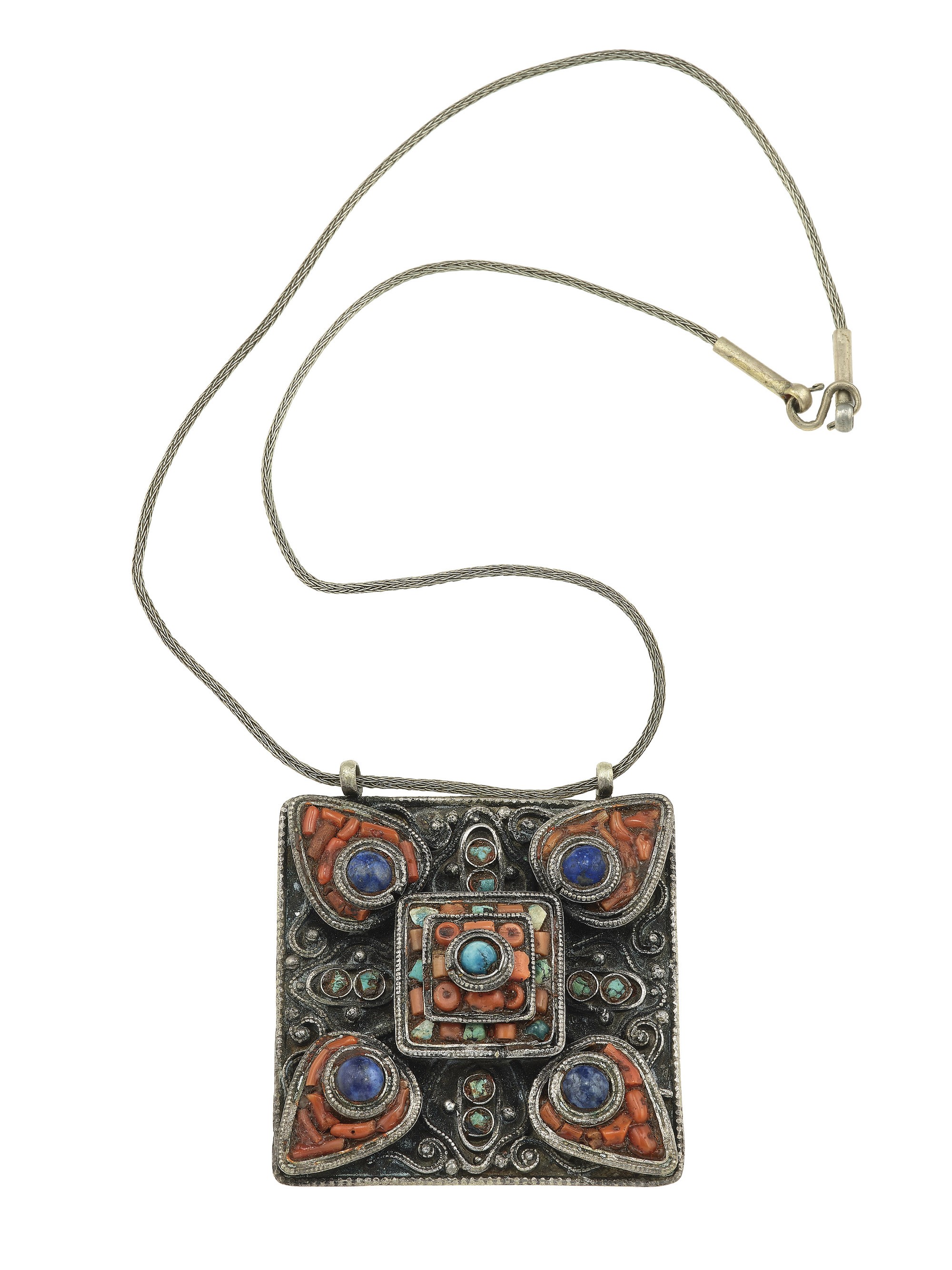 Coral, lapis-lazuli, turquoise and metal pendant
