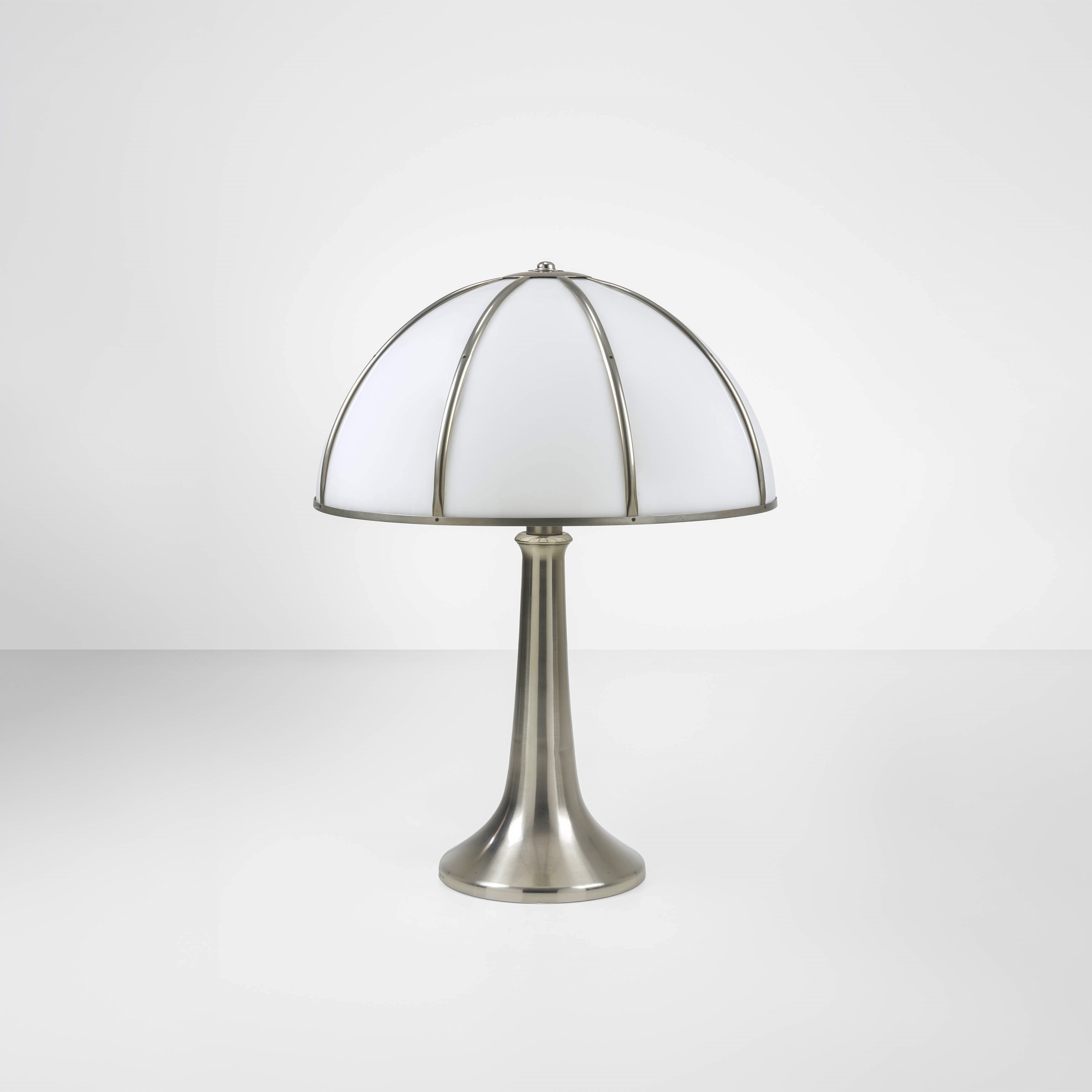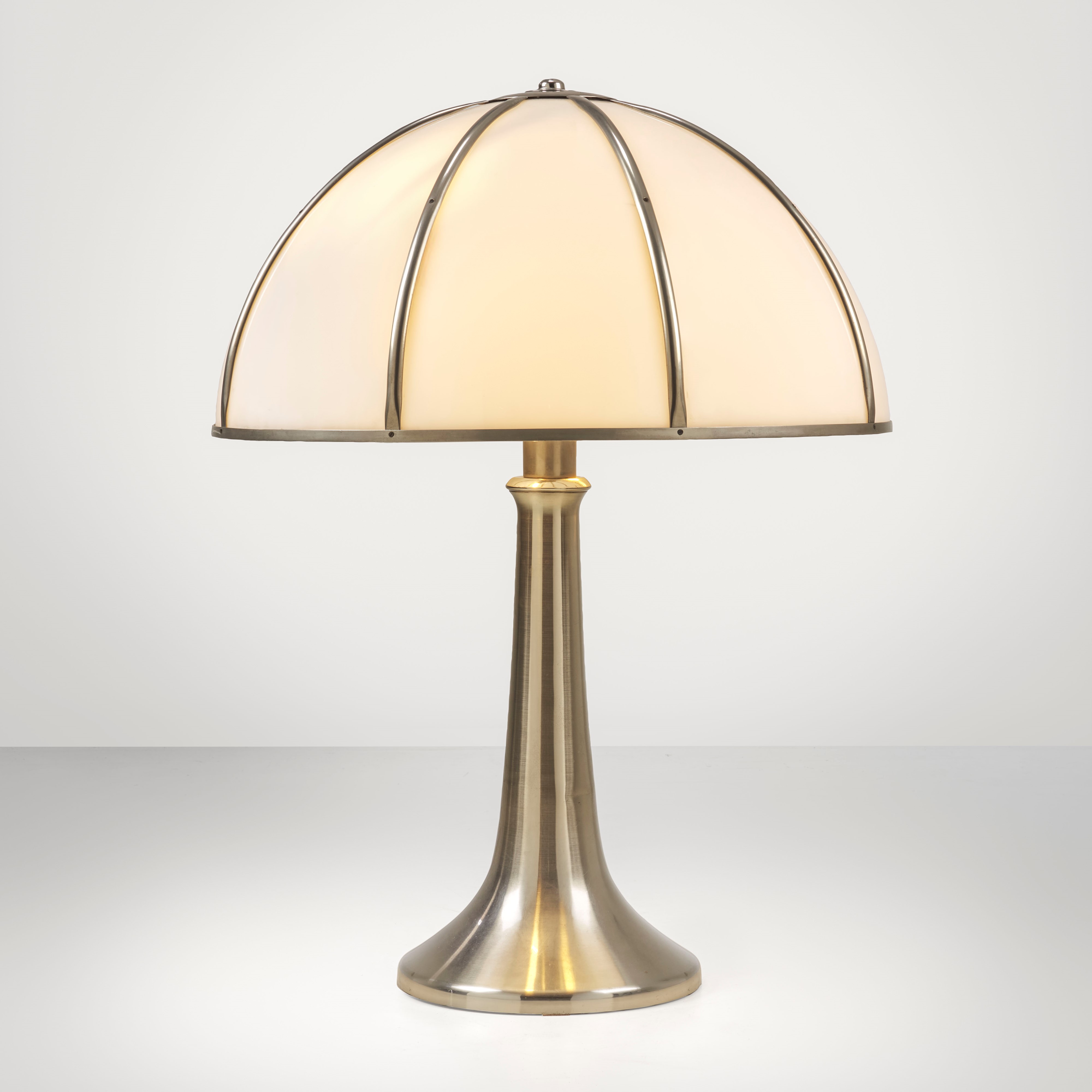 Nickel-plated brass structure, nickel- plated brass and perspex lampshade. Engraved signature.