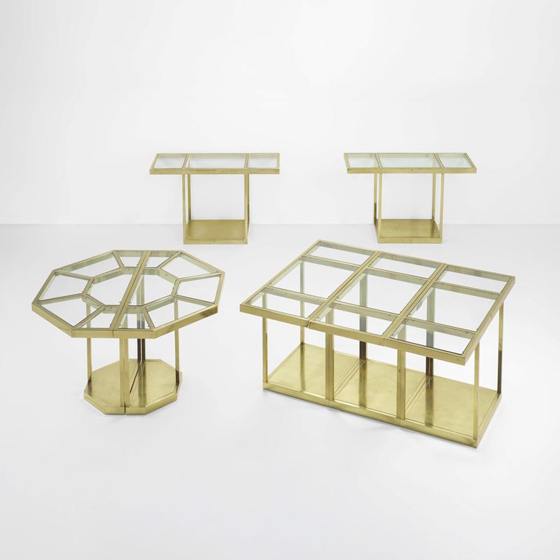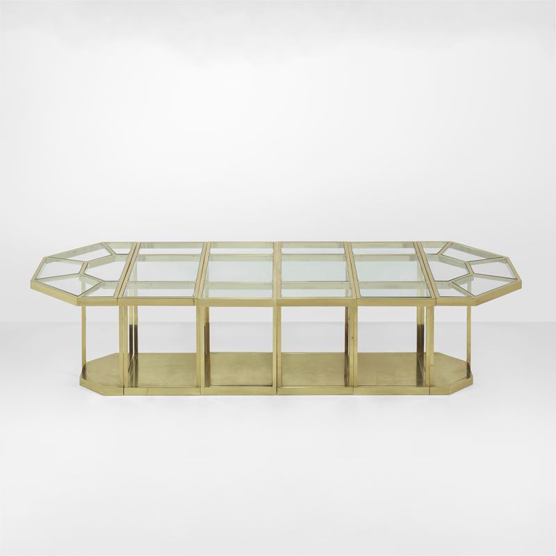 The “Puzzle Table,” a dining table made of brass, is like a metal structure with glass tops, each identifying a single place at the table, starting from an octagonal table composed of two consoles that can be expanded infinitely according to desire and need.