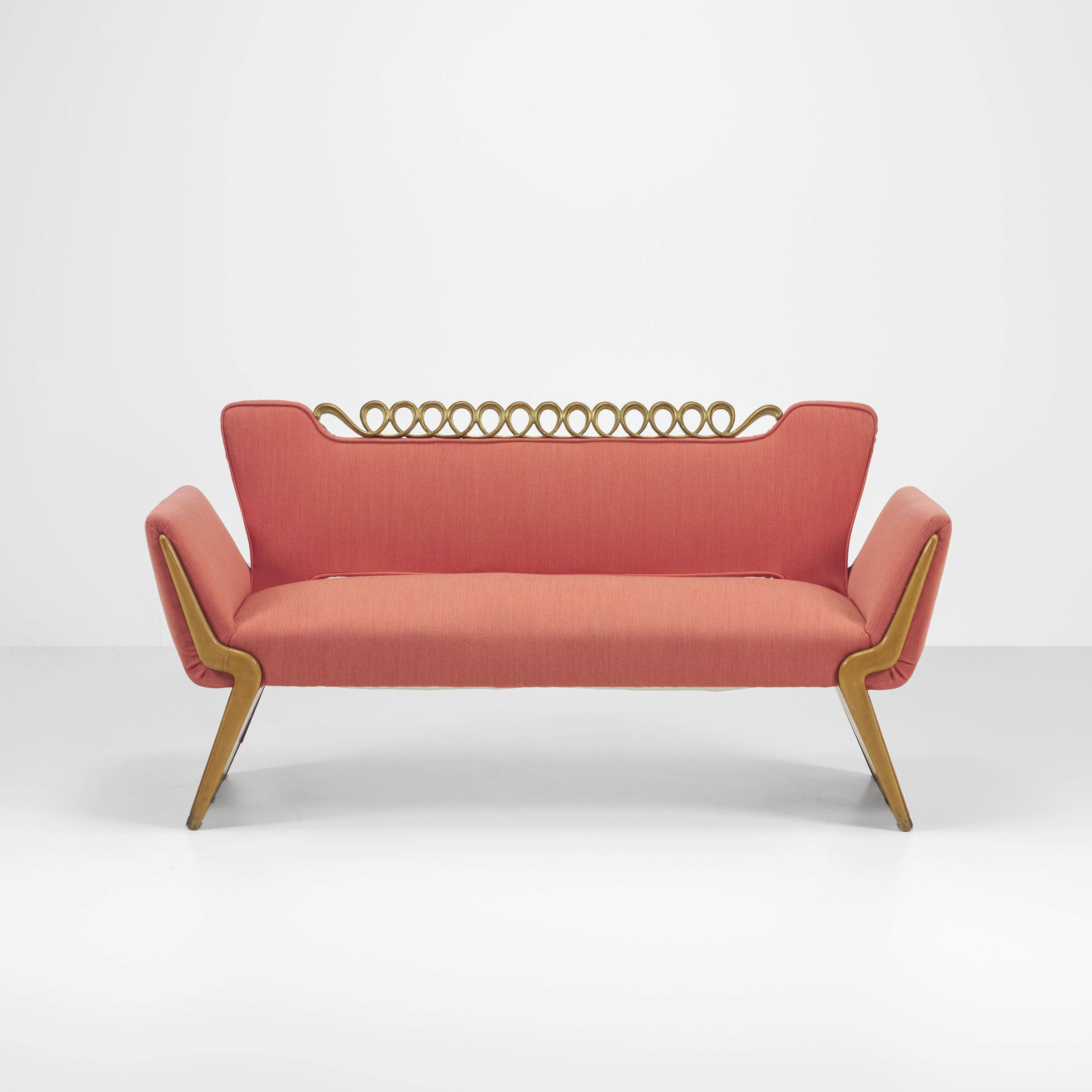 Wooden structure, fabric upholstery. Decorative motif in gilded wood.