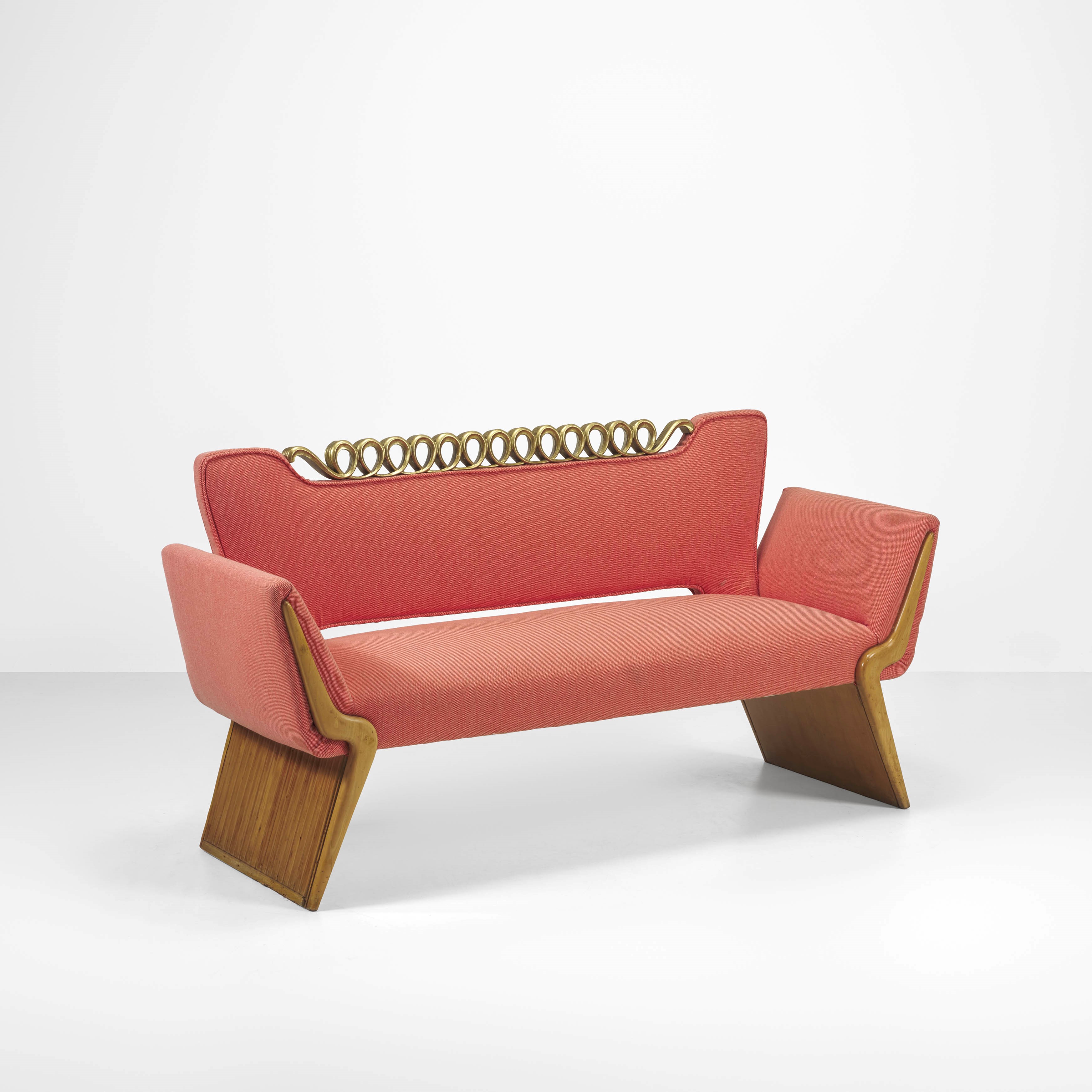 Wooden structure, fabric upholstery. Decorative motif in gilded wood.