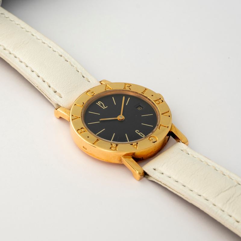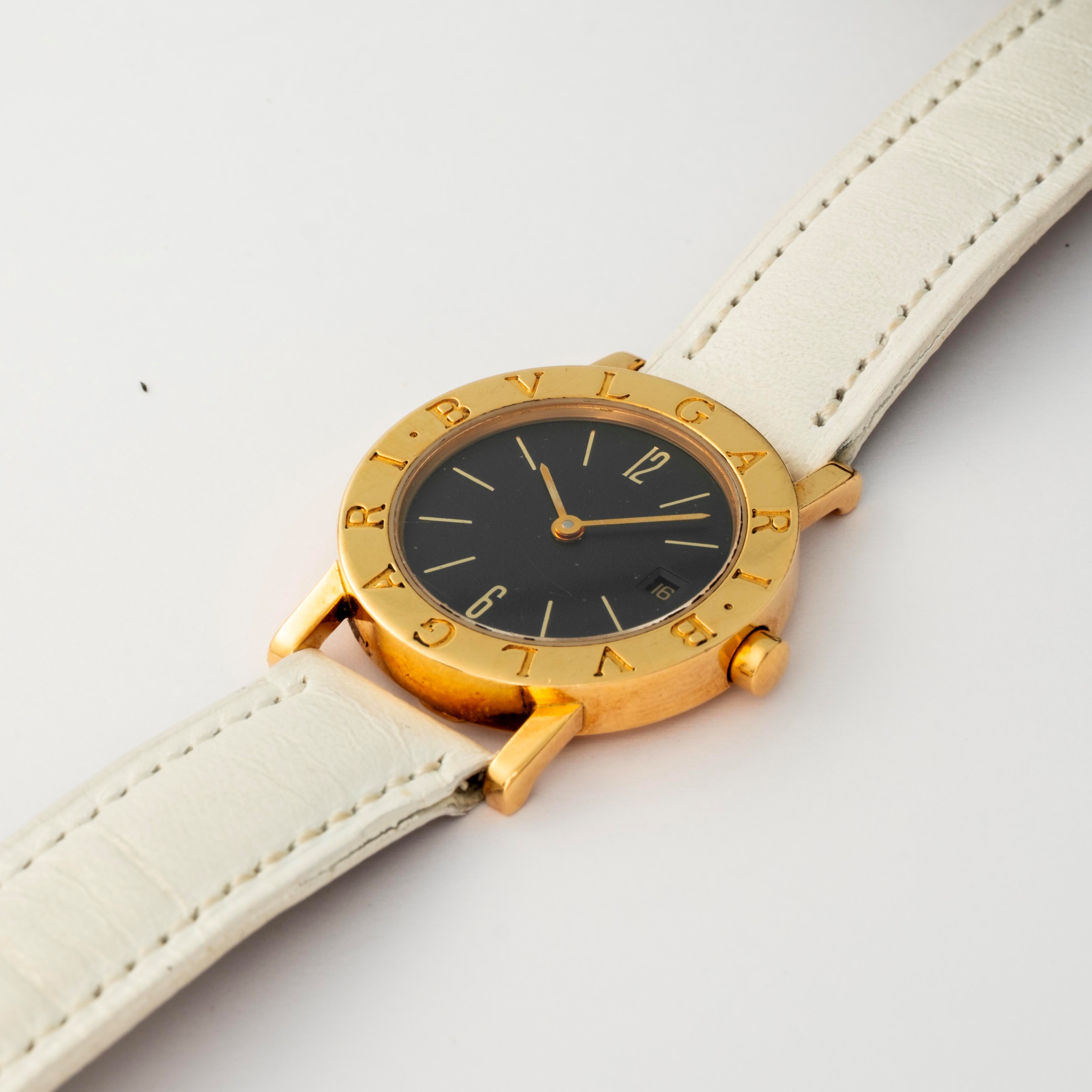 Bulgari Lady in yellow gold 18k, black dial with date at 3 o’clock and applied indexes, circa 1990