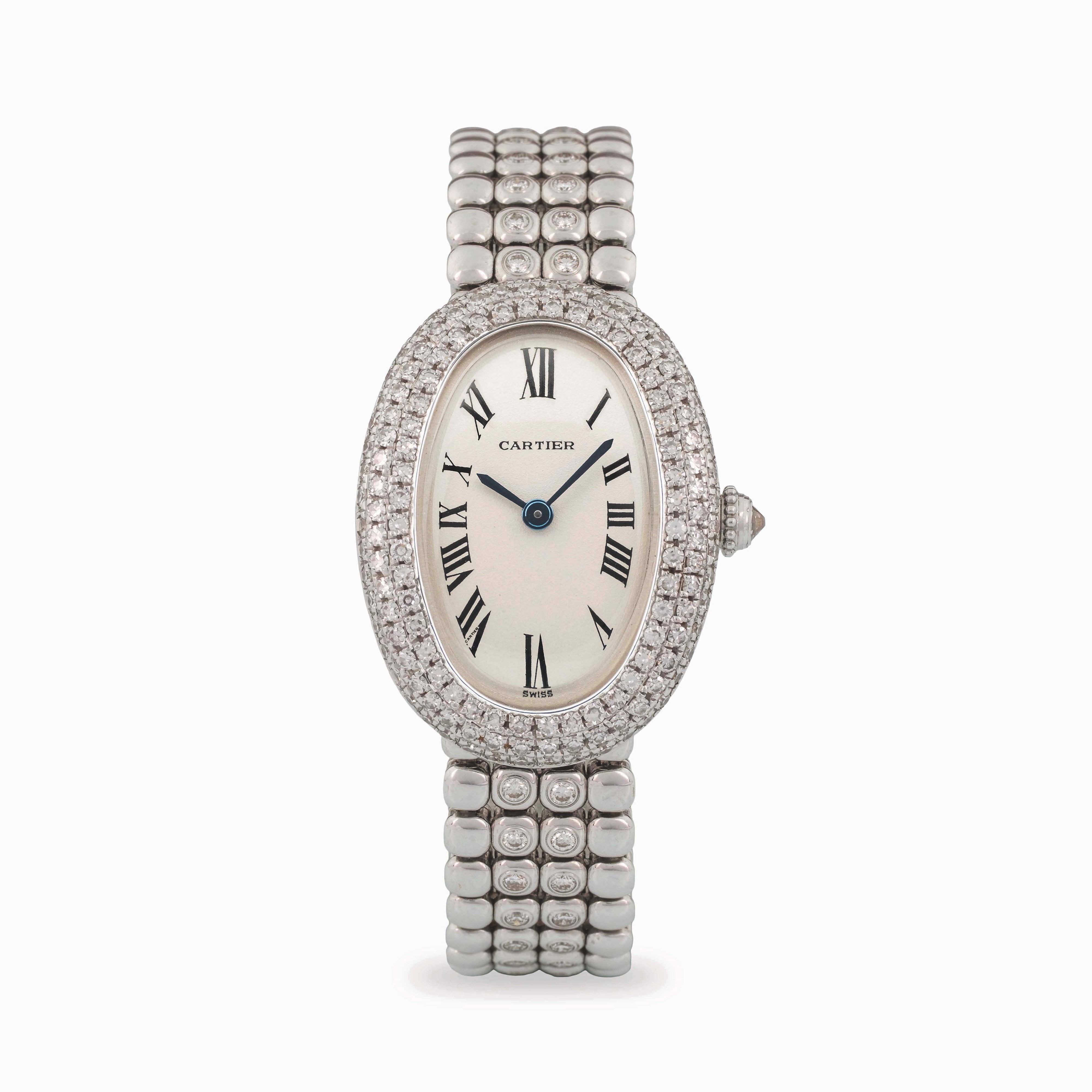 Baignoire in 18k white gold with diamonds, silvered dial with Roman numerals, original diamond-set bracelet, circa 1990