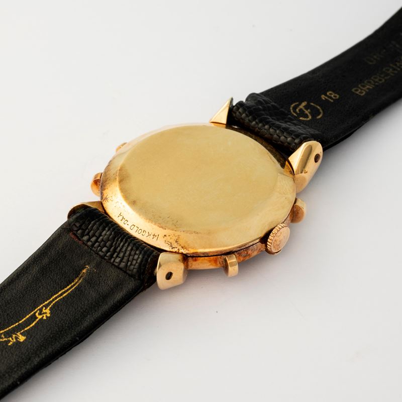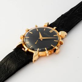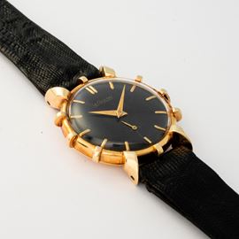 "Ship's Wheel" in yellow gold 14k, black dial with applied indexes and small seconds at 6, circa 1950