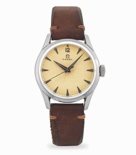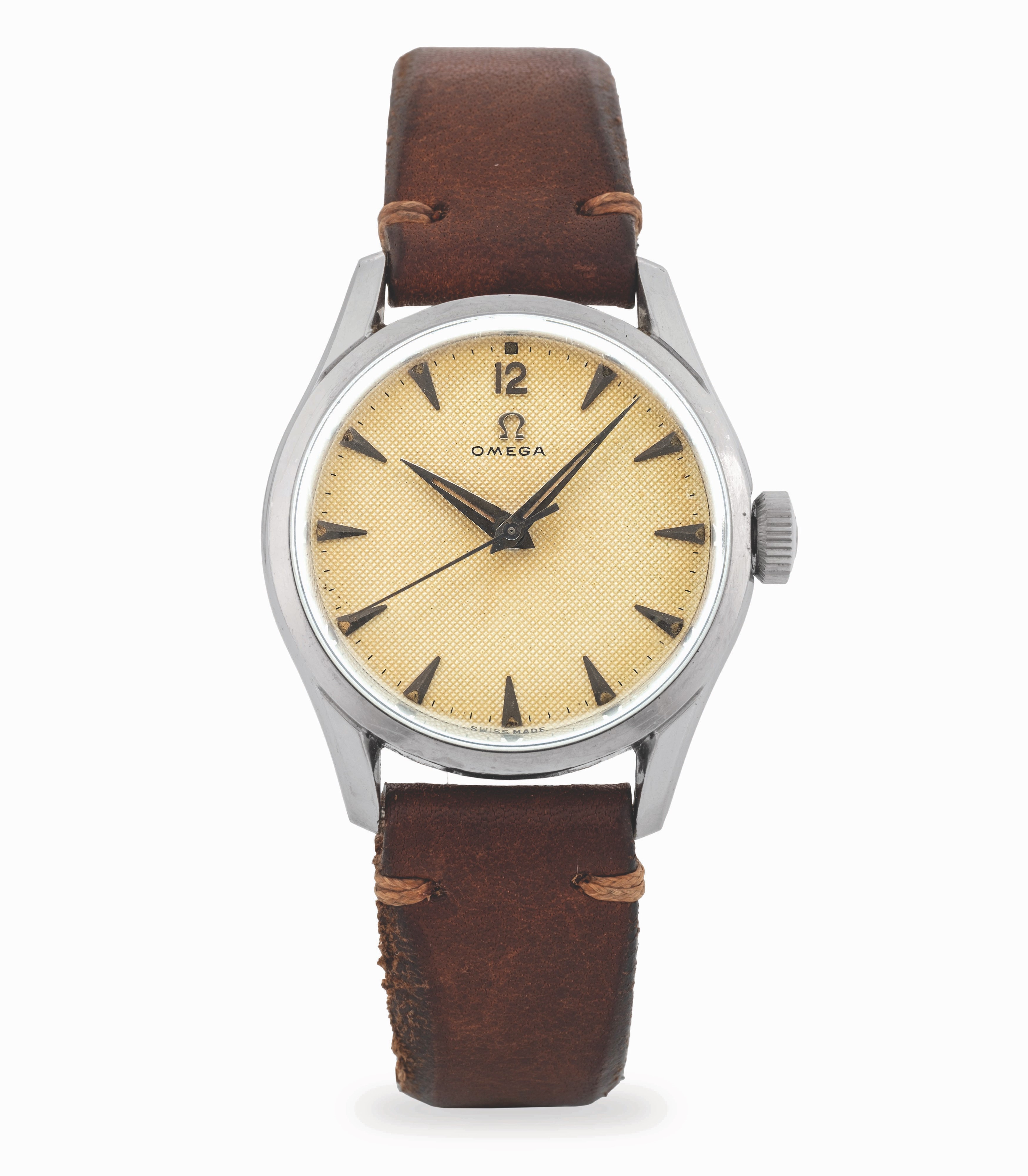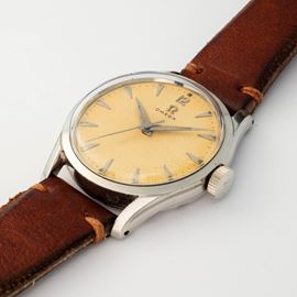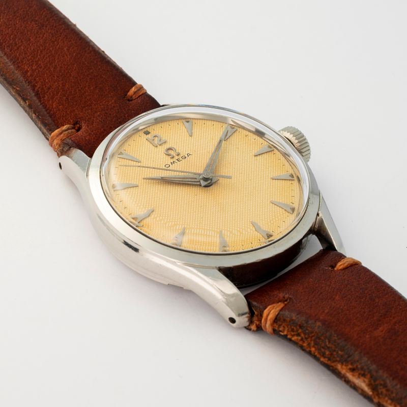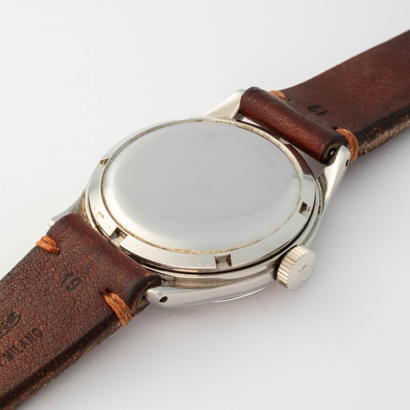 Manual-winding time-only watch with guilloché dial and applied indexes, circa 1952