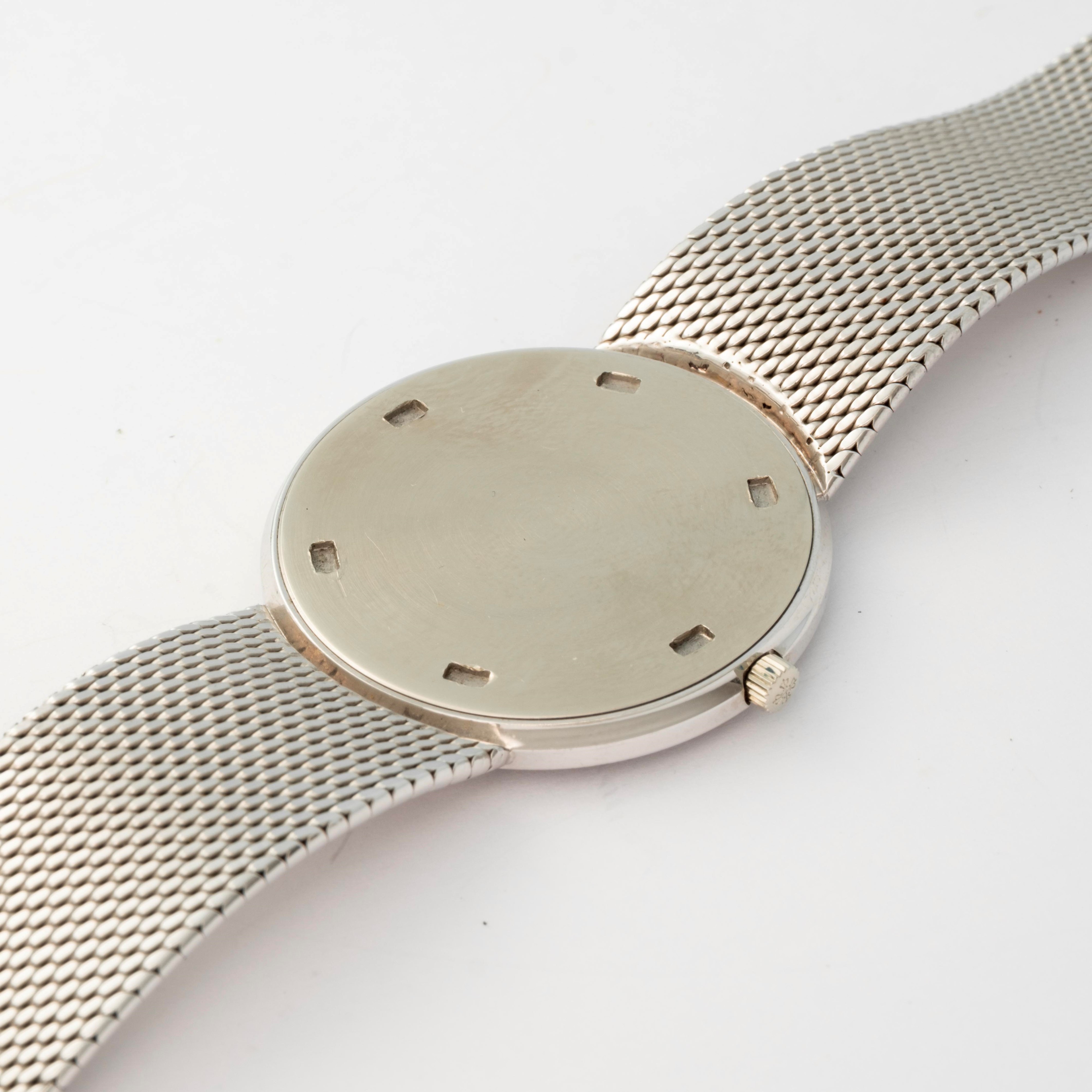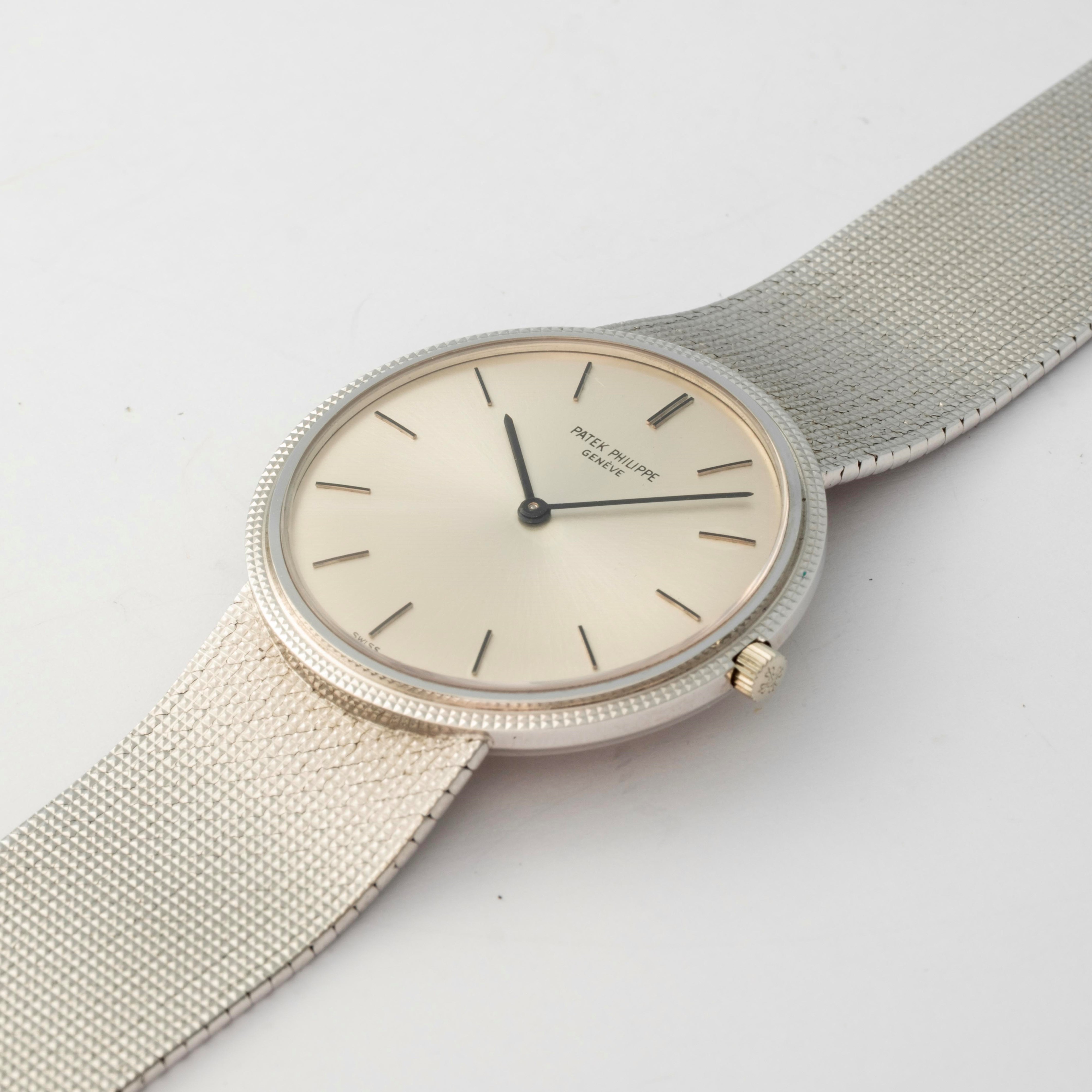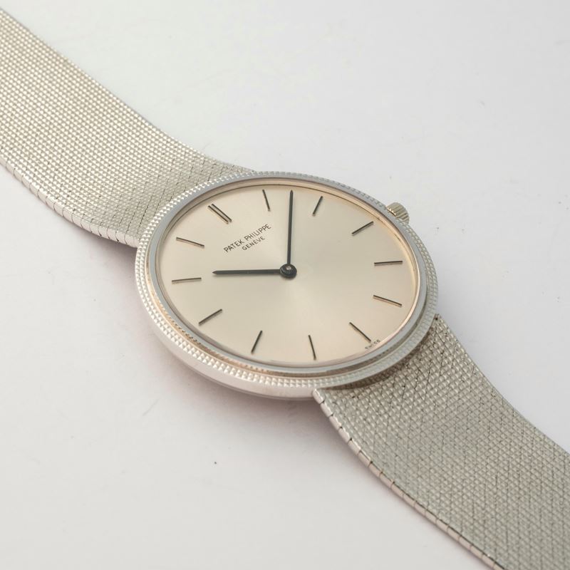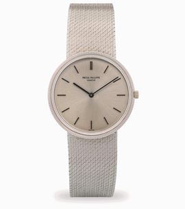 Calatrava in white gold 18k with integrated bracelet, silvered soleil dial, circa 1970