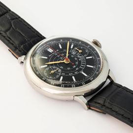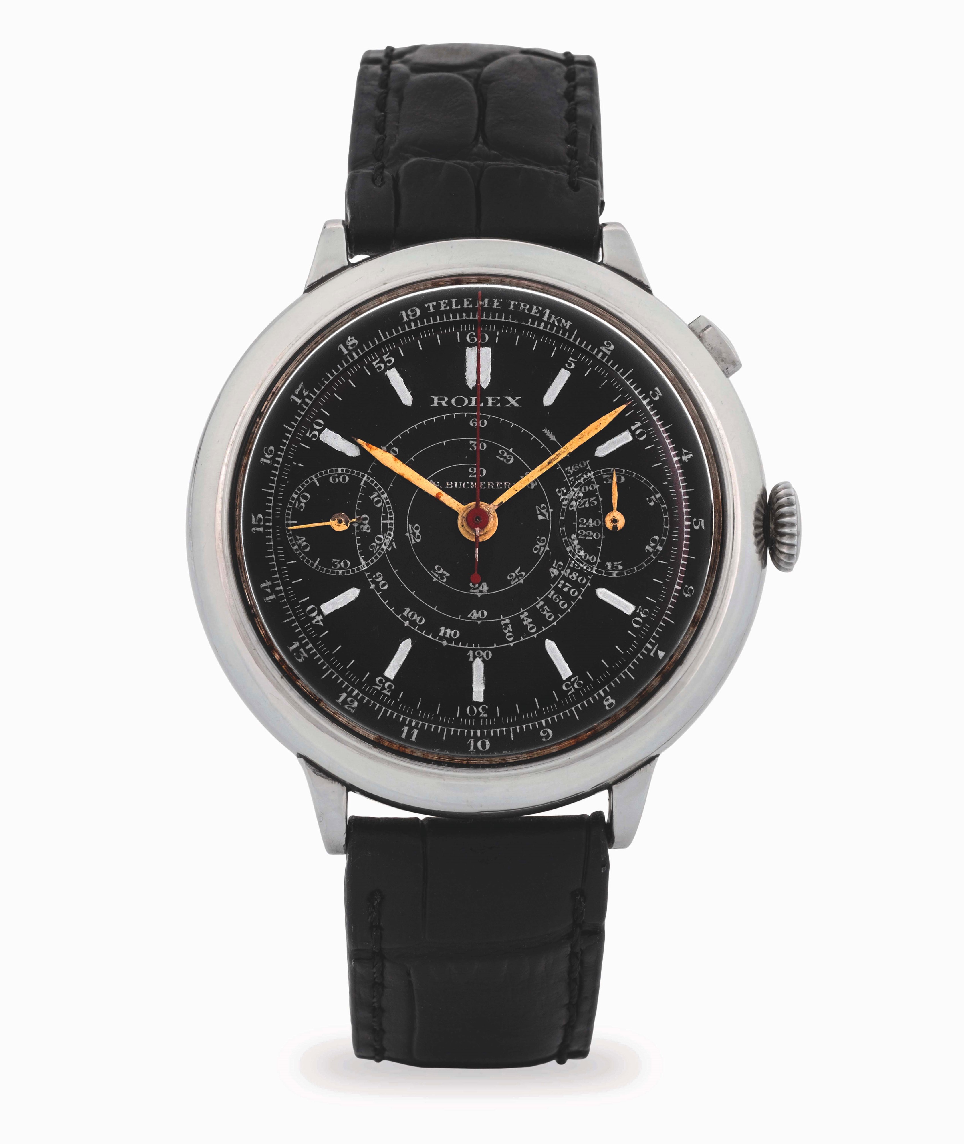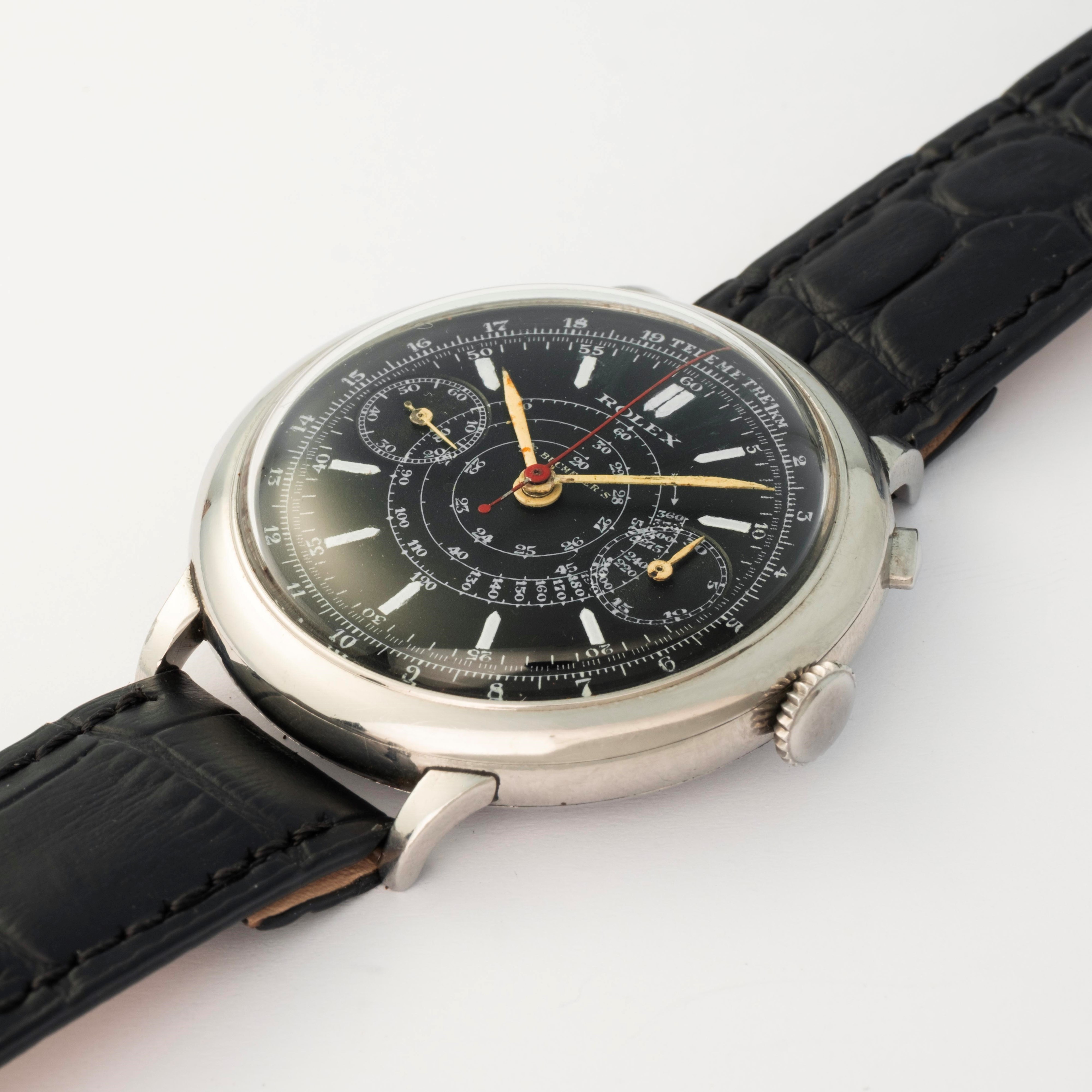 The combination of the rare stainless steel case with the uncommon black dial makes this watch particularly unique, a charm further enhanced by the presence of the Bucherer’s signature on the dial.