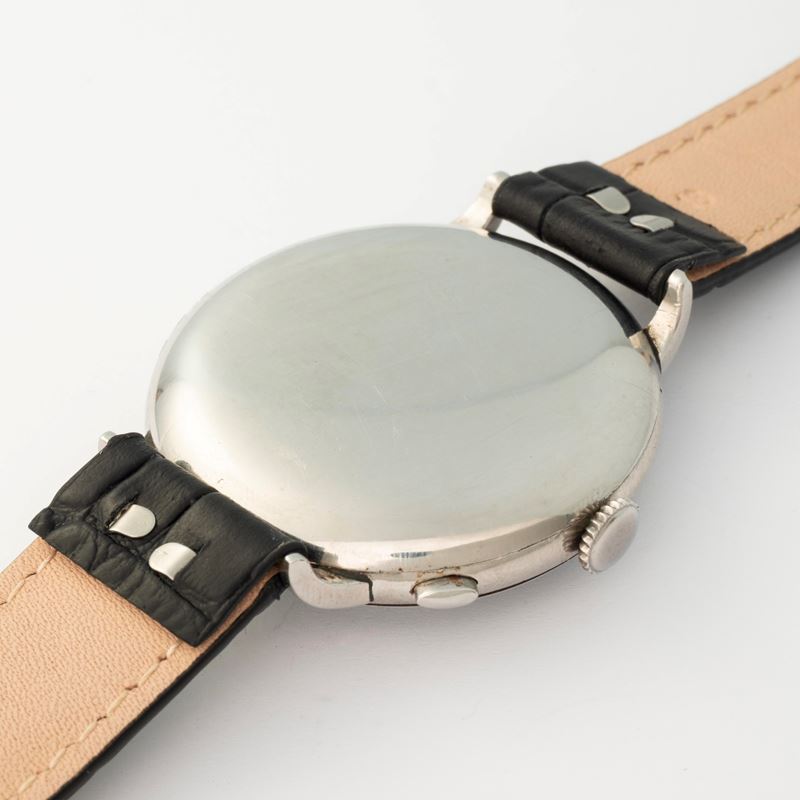 Chronograph ref. 2021 in stainless steel, monopusher, with black two-subdial dial and Bucherer’s signature, circa 1930