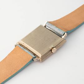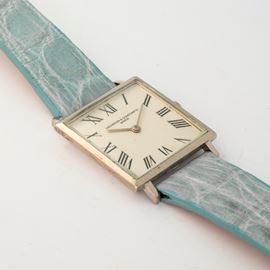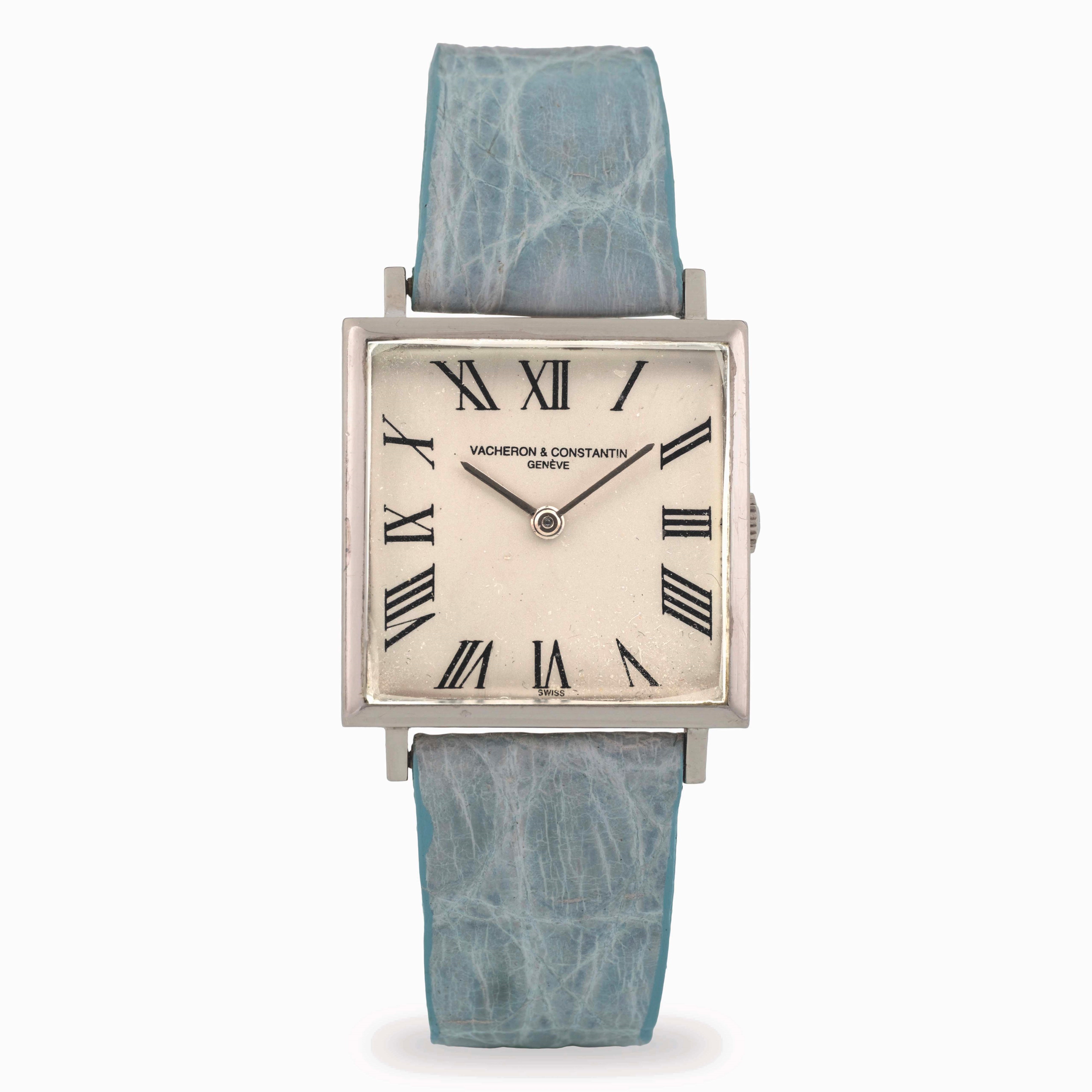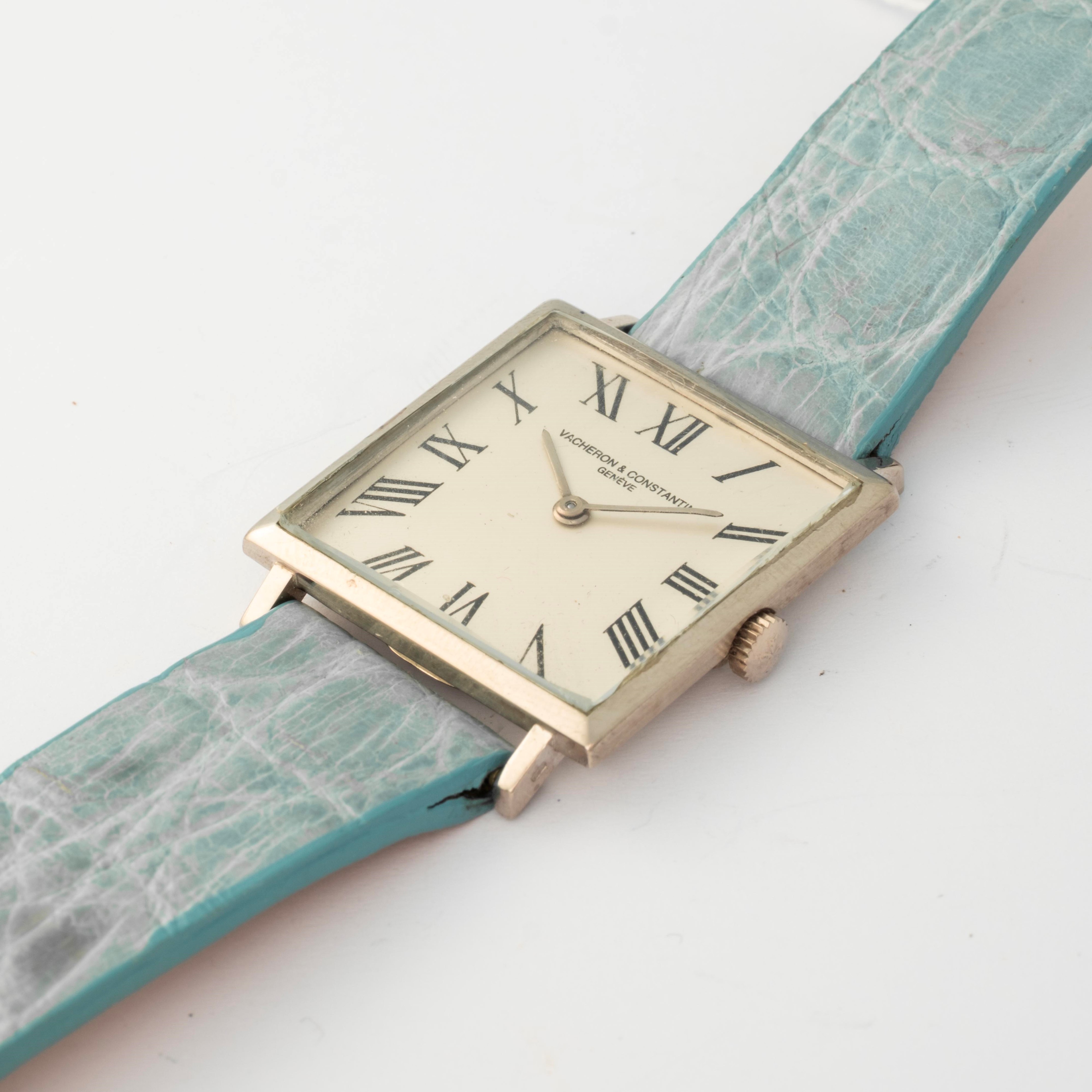 Ultra-thin rectangular manual-winding watch in white gold 18k, silvered dial with Roman numerals, circa 1960