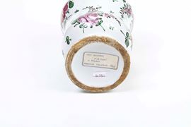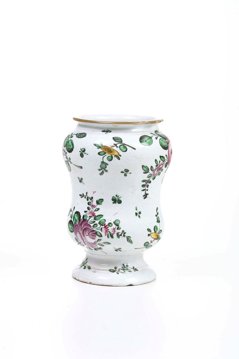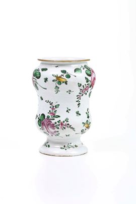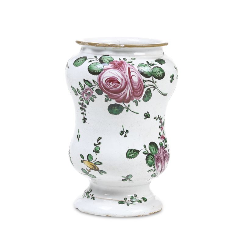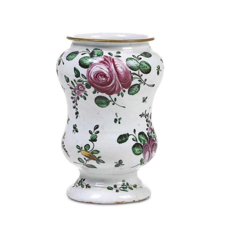 Albarello dal corpo a balaustro decorato a piccolo fuoco con mazzi asimmetrici di fiori “alla rosa” e tralci fioriti sparsi