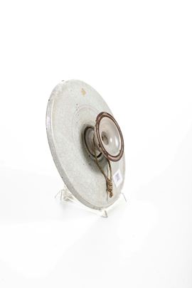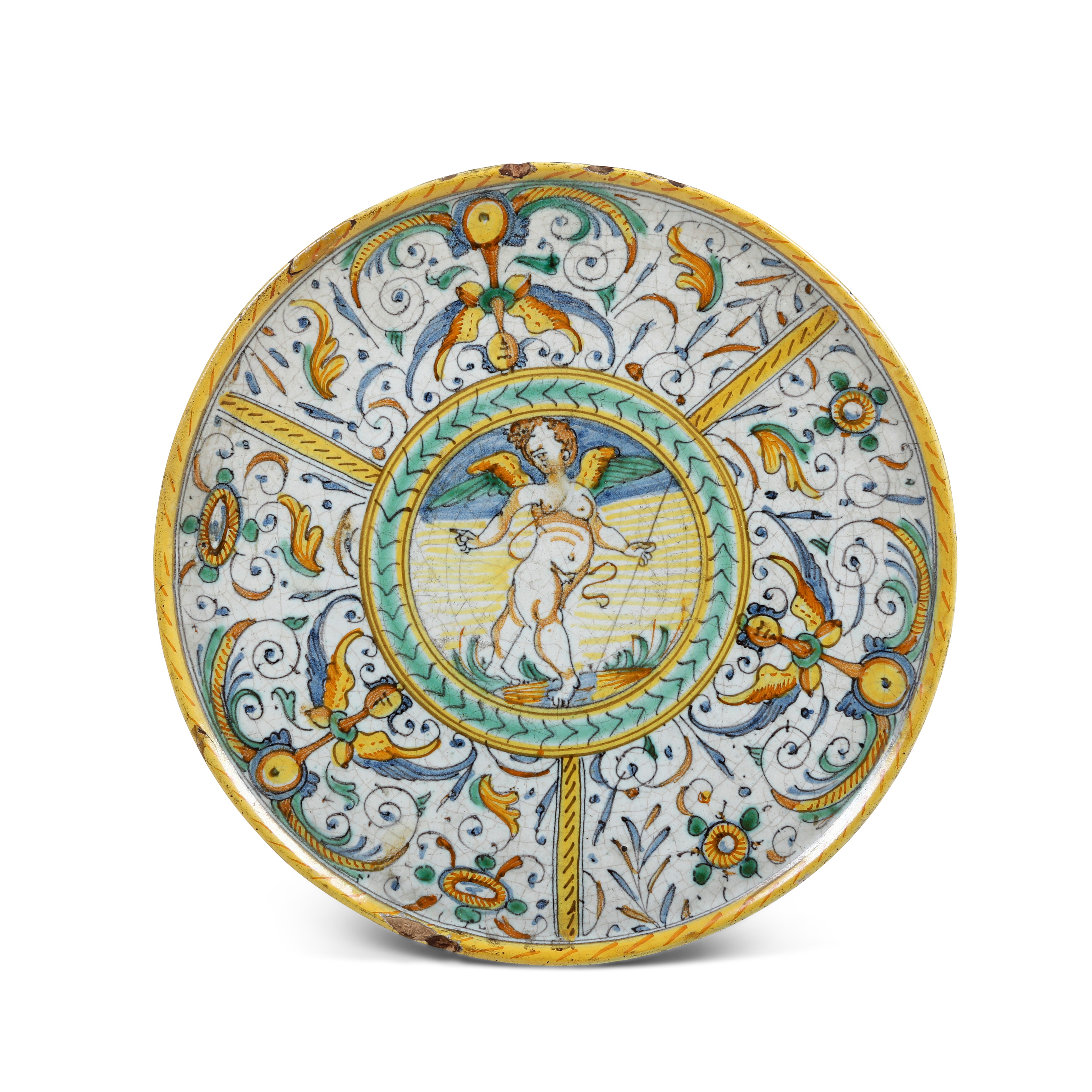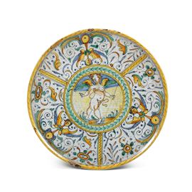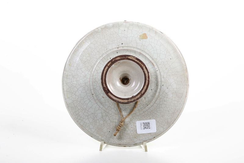 Maiolica. Dimensioni: altezza cm 5,5; diametro cm 25,2. Conservazione: buona; piccole sbeccature ai bordi