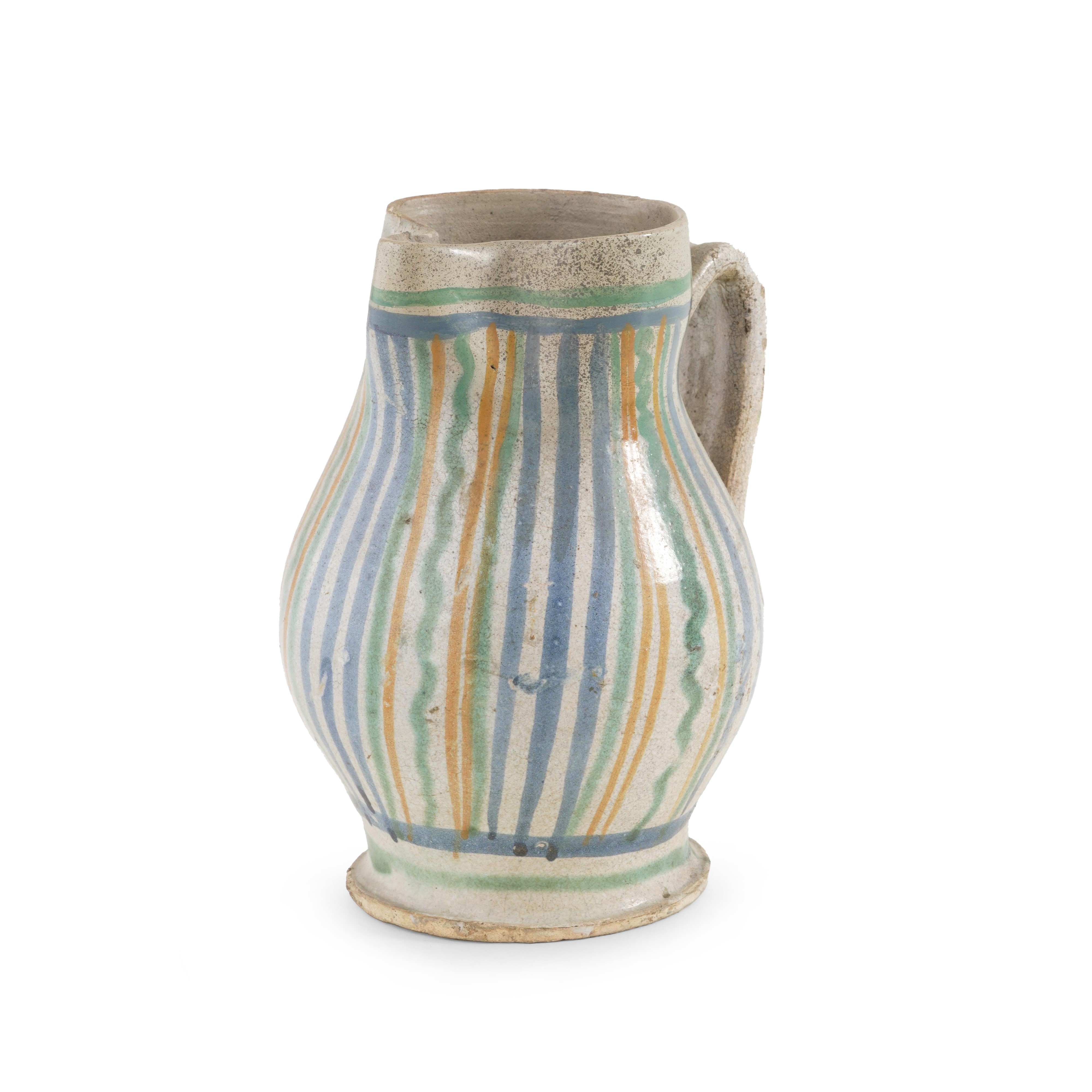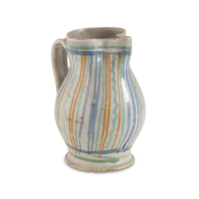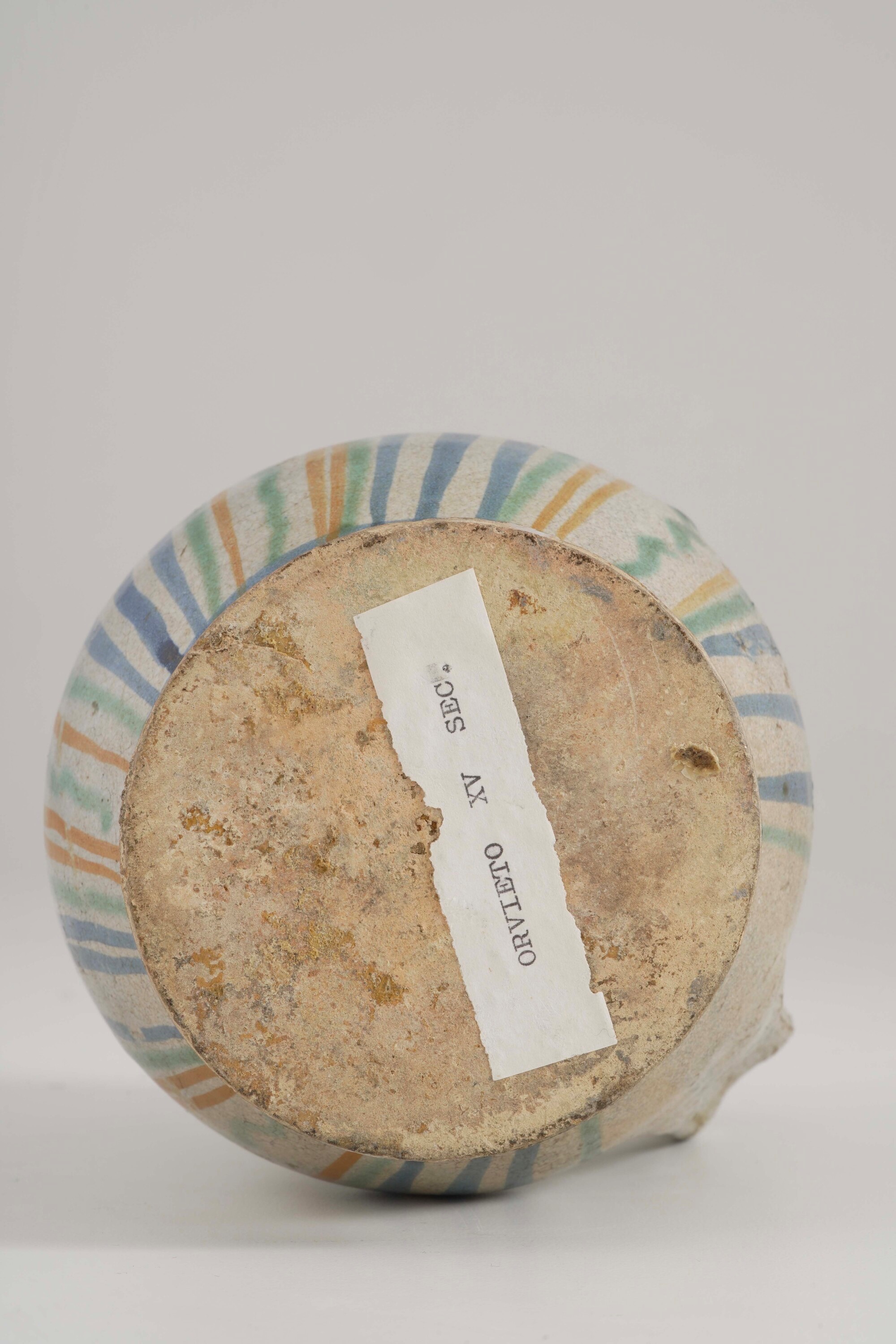 Maiolica. Altezza cm 16,8; diametro piede cm 9. Conservazione: 50% del bordo superiore integrato